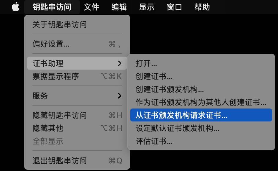 4. 在 Mac 上打开钥匙串访问工具(Keychain Access),在菜单中选择钥匙串访问 > 证书助理 > 从证书颁发机构请求证书(