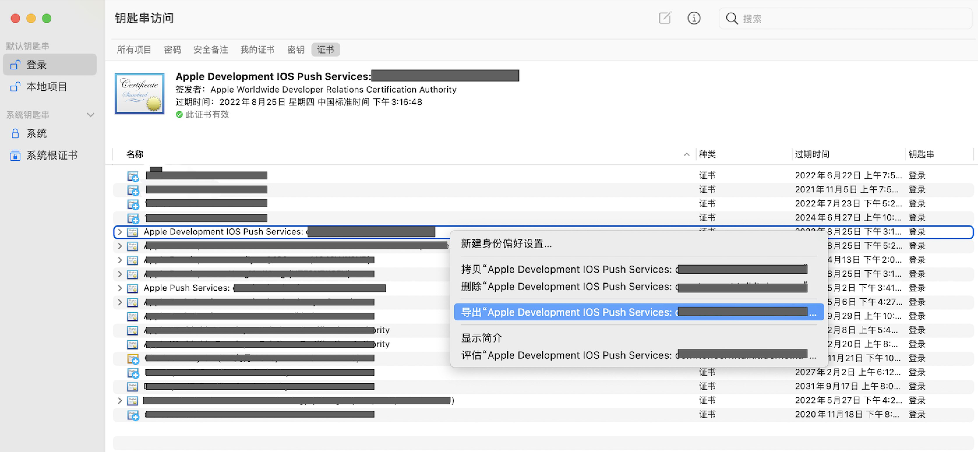 ,系统会将其导入钥匙串中。11. 打开钥匙串应用,在登录 > 我的证书,右键分别导出刚创建的开发环境(