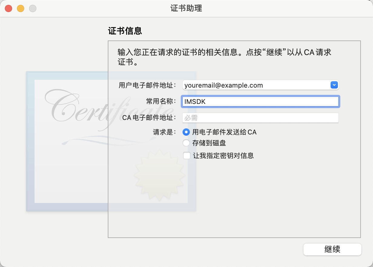 5. 输入用户电子邮件地址(您的邮箱)、常用名称(您的名称或公司名),选择存储到磁盘,单击继续,系统将生成一个