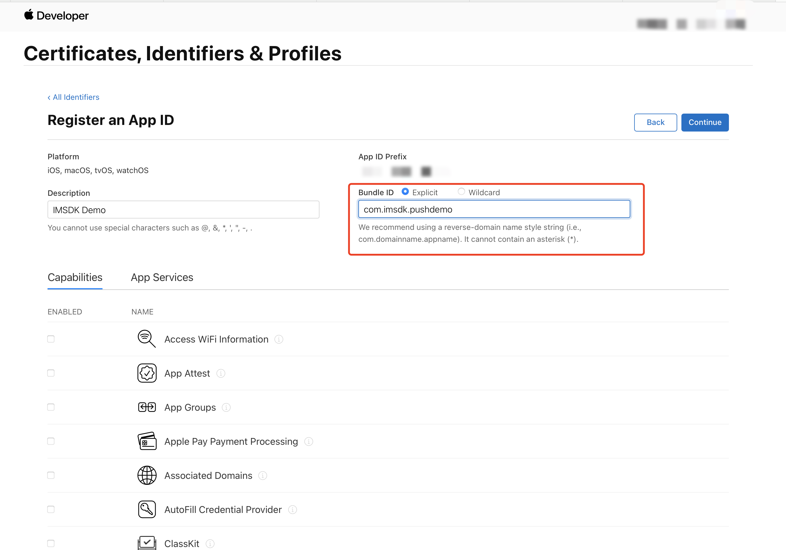 ,否则将无法使用远程推送服务。4. 勾选 App IDs,单击 Continue 进行下一步。