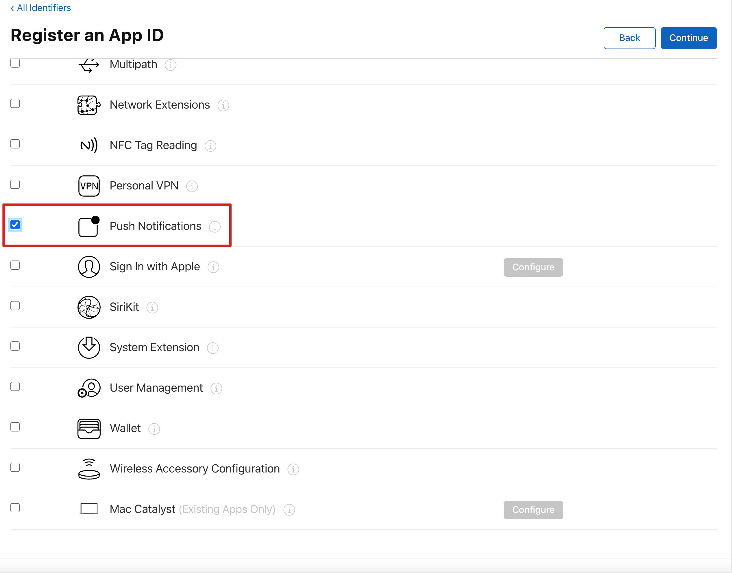 7. 勾选 Push Notifications,开启远程推送服务。