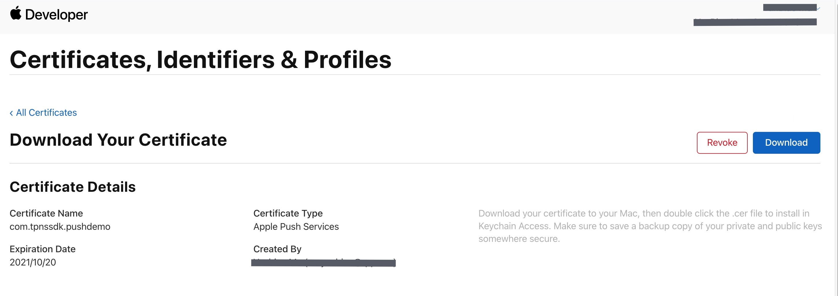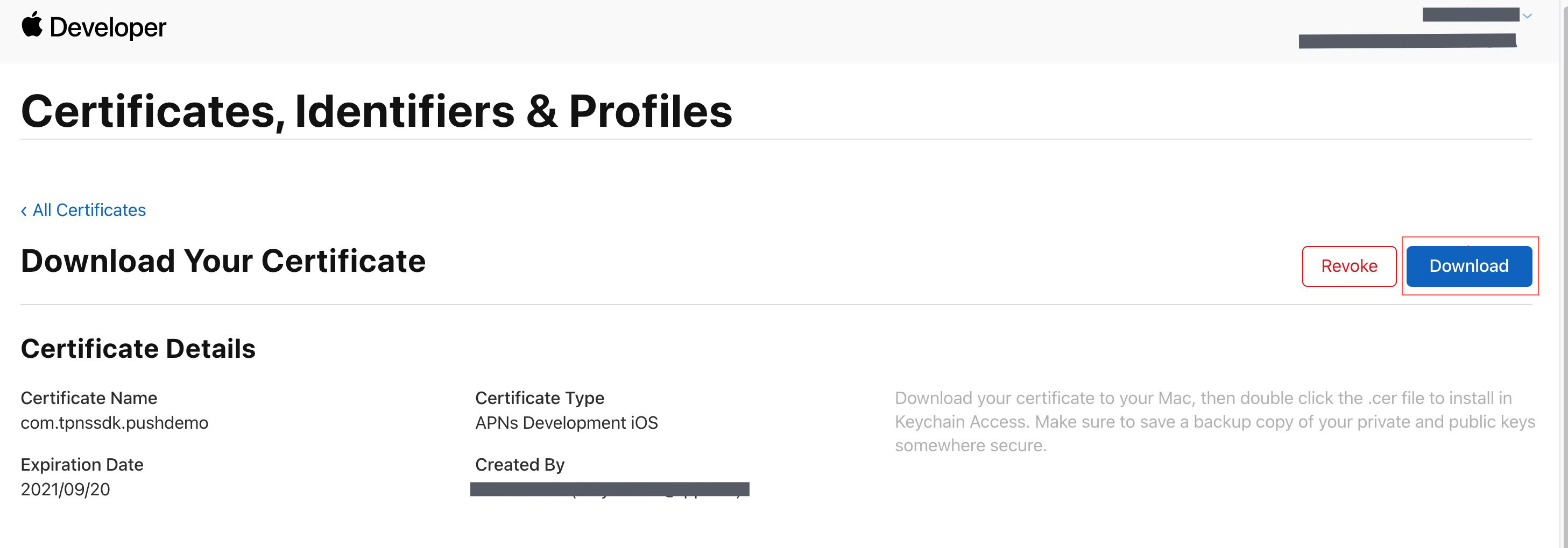 7. 单击 Continue,即可生成推送证书。