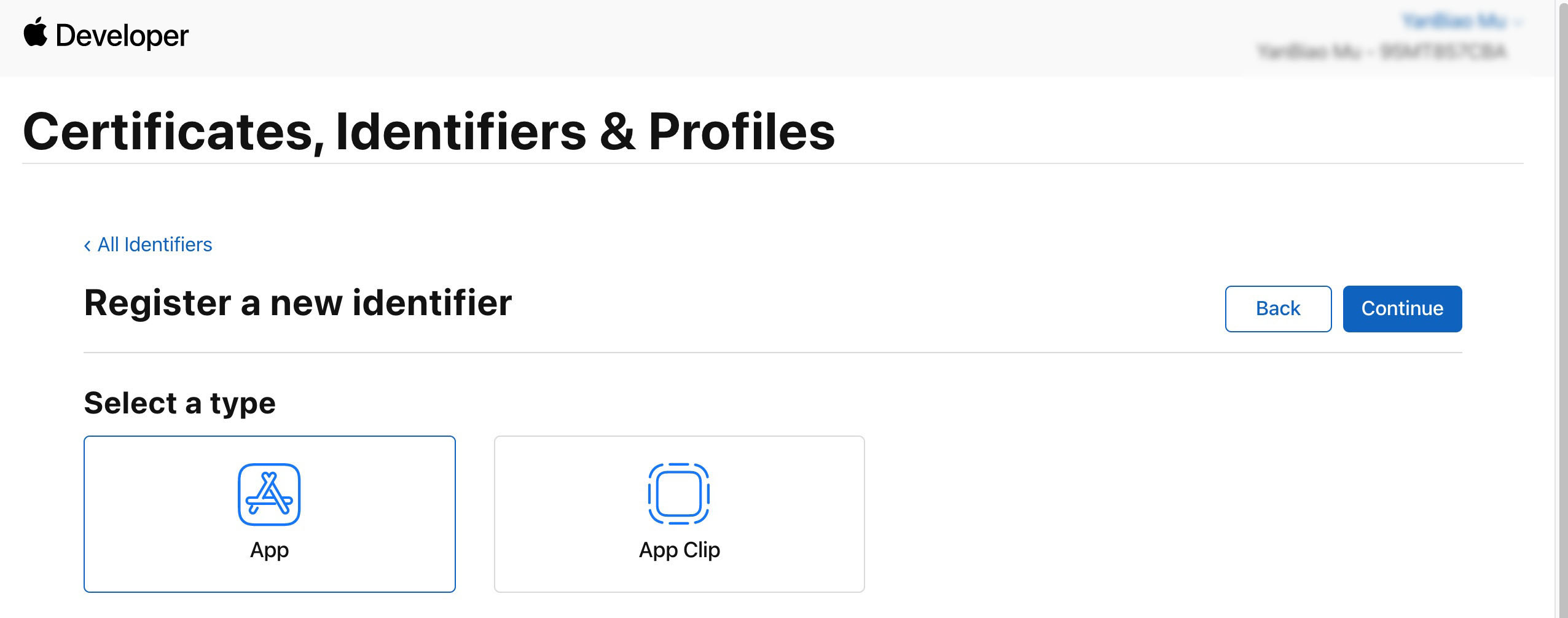 5. 选择 App,单击 Continue 进行下一步。