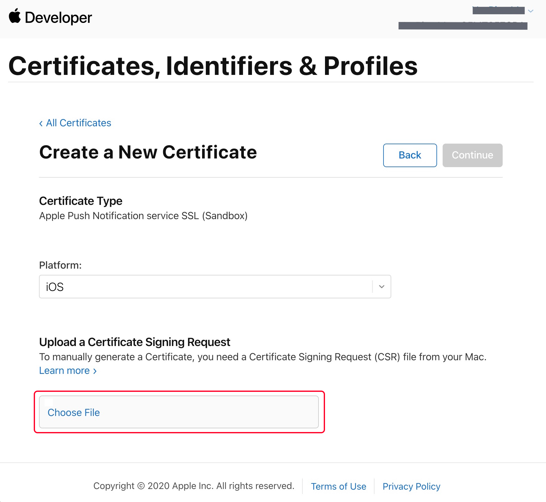 6. 返回上述 步骤3 中 Apple Developer 网站刚才的页面,单击 Choose File 上传生成的