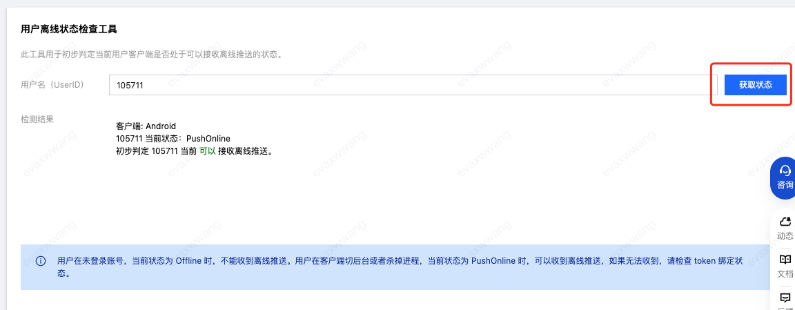 此工具用于初步判定当前用户客户端是否处于可以接收离线推送的状态。输入用户名后单击获取状态,检测结果会显示该用户当前是否可以接收离线推送。