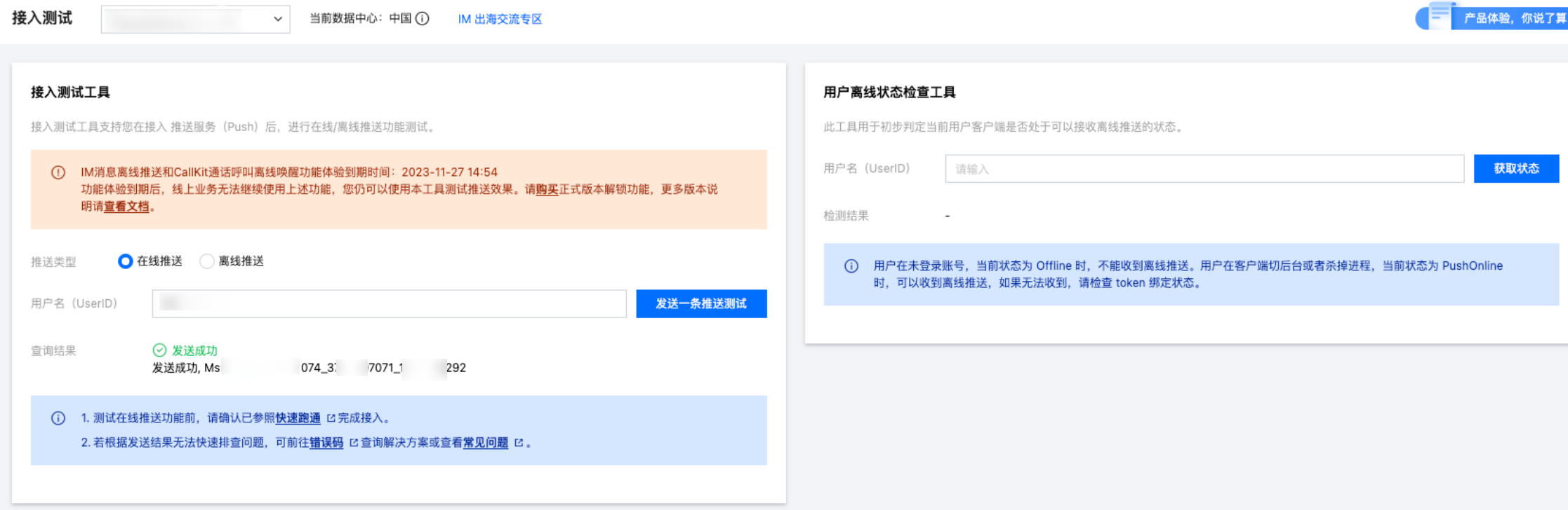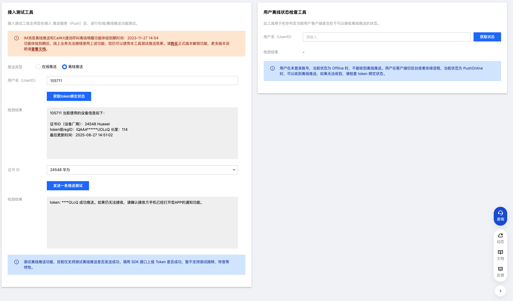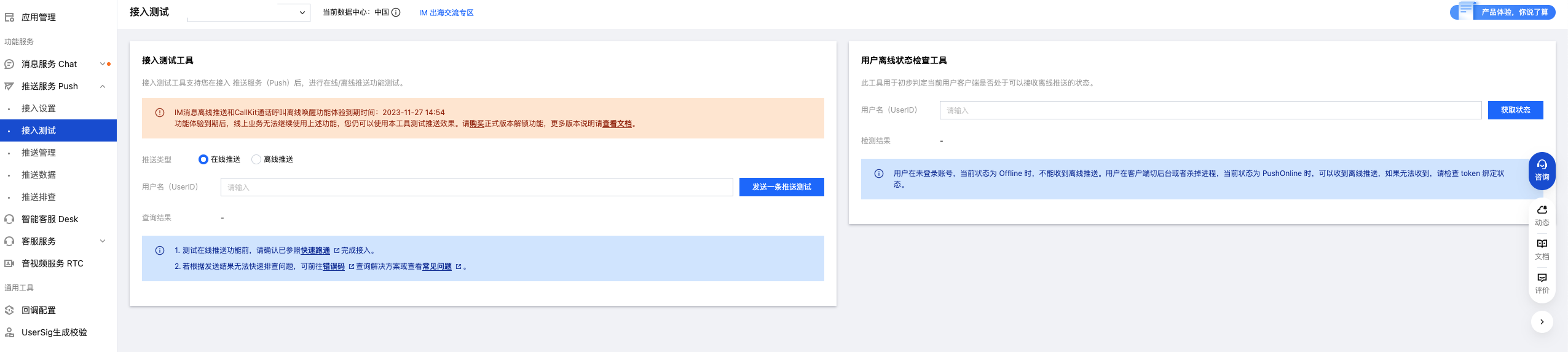 接入测试页面包含接入测试工具和用户离线状态检查工具,帮助开发者高效验证推送接入是否成功、判断用户或设备的推送消息接收状态。