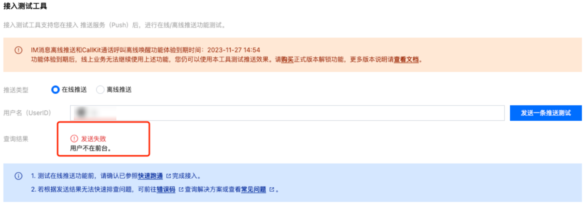 在推送类型中选择在线推送,输入用户名(UserID),点击发送一条推送测试,查询结果会出现测试结果。