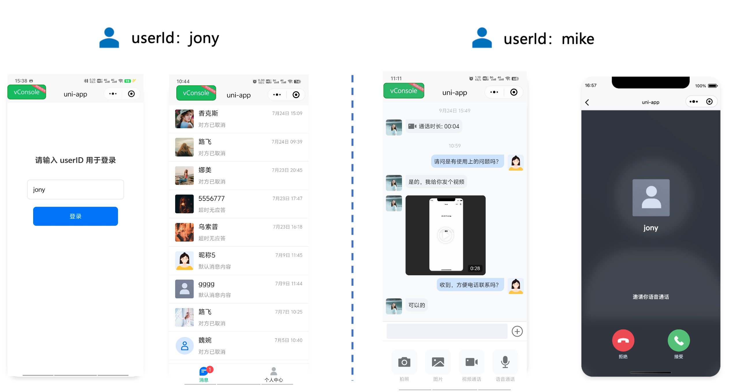 会话列表 | 聊天页面 | 视频通话 |