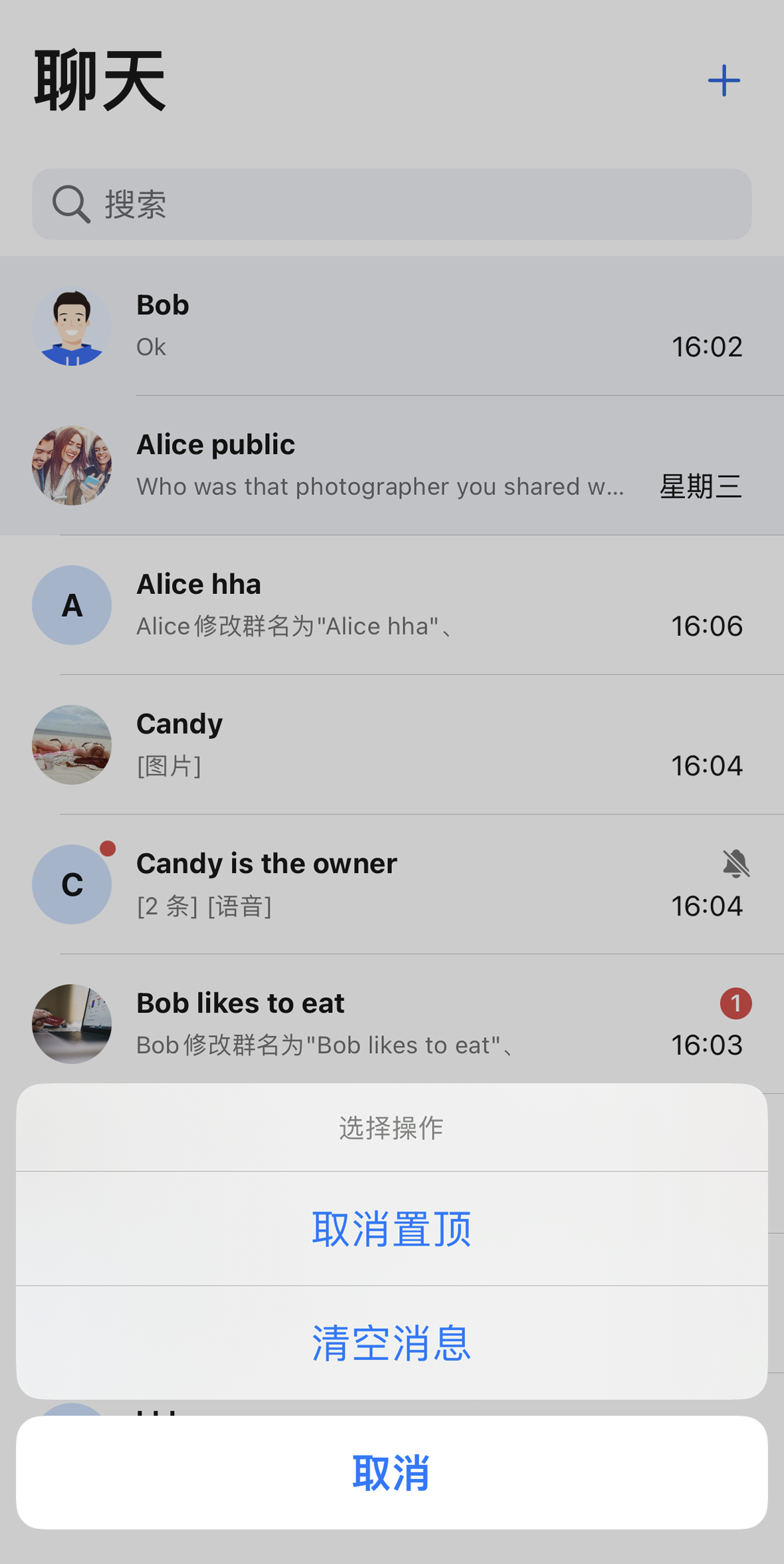AppBuilderConfig 进行全局配置:// 在应用启动时配置,不包含则不支持AppBuilderConfig.shared.conversationActionList = [.delete, // 支持删除.pin, // 支持置顶.clearHistory // 清空会话消息]// 接下来再初始化 ConversationList,所有的 ConversationList 都会遵守上面 conversationActionList 的配置ConversationList(onConversationClick: { conversation in// 这里可以导航到聊天页面})