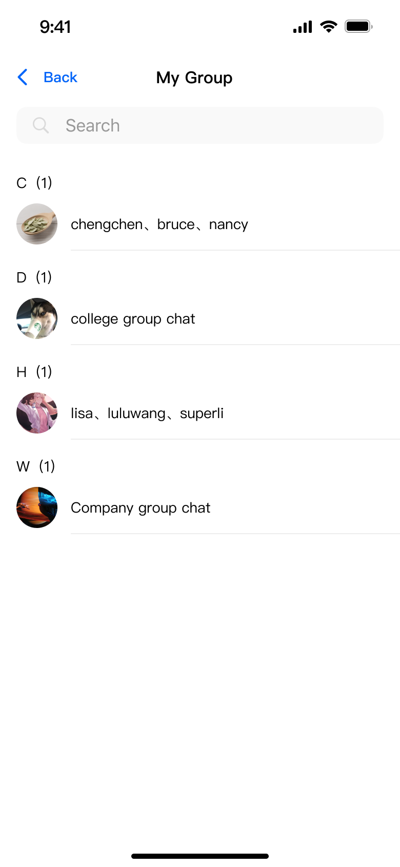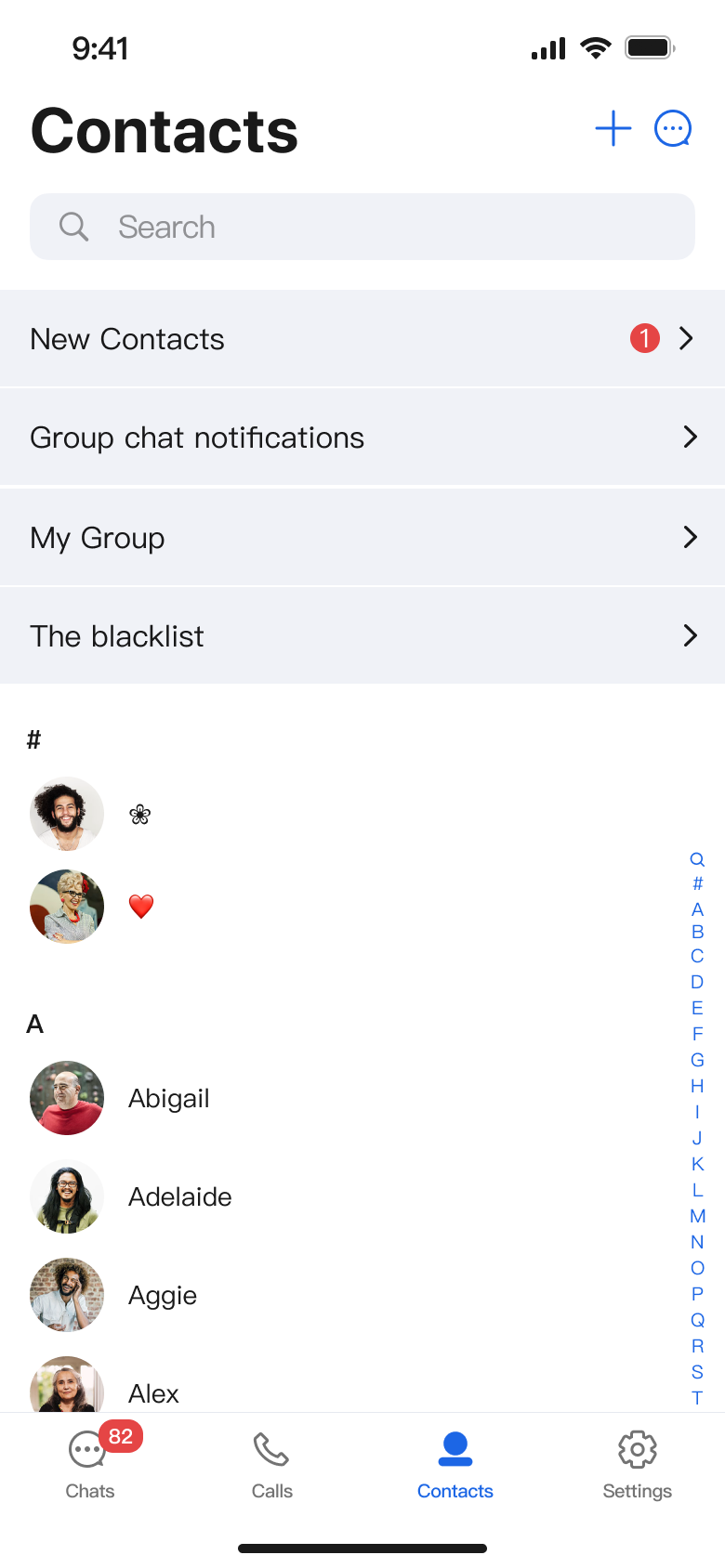 ContactList 上半部分预留了各个子视图的入口 cell,例如好友申请、群聊申请、群组列表和黑名单列表。下半部分内嵌了联系人列表,如下图所示: