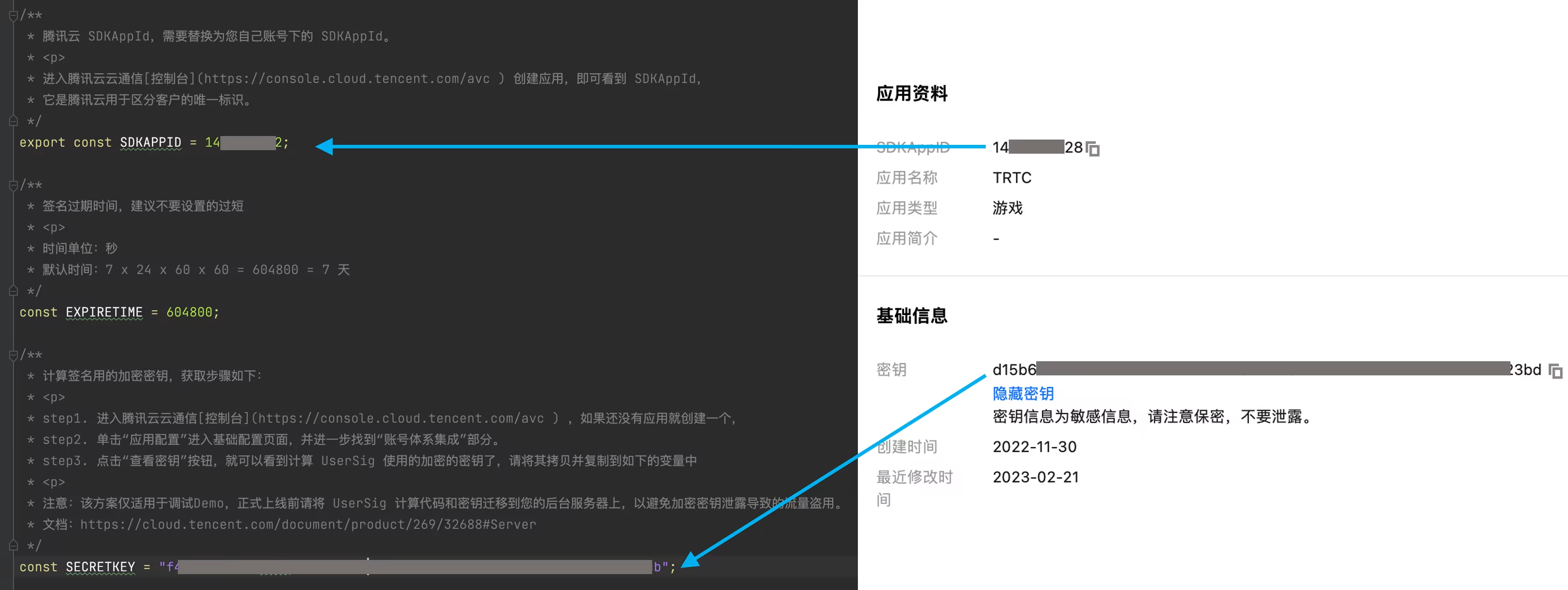 设置 GenerateTestUserSig.ts 文件中的相关参数: