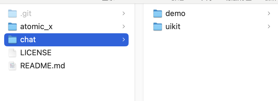 1. 将组件目录完整复制到您的鸿蒙项目中,如下图所示,其中 chat/demo 是示例项目,atomic_x 是从 GitHub 上下载的组件源码:
