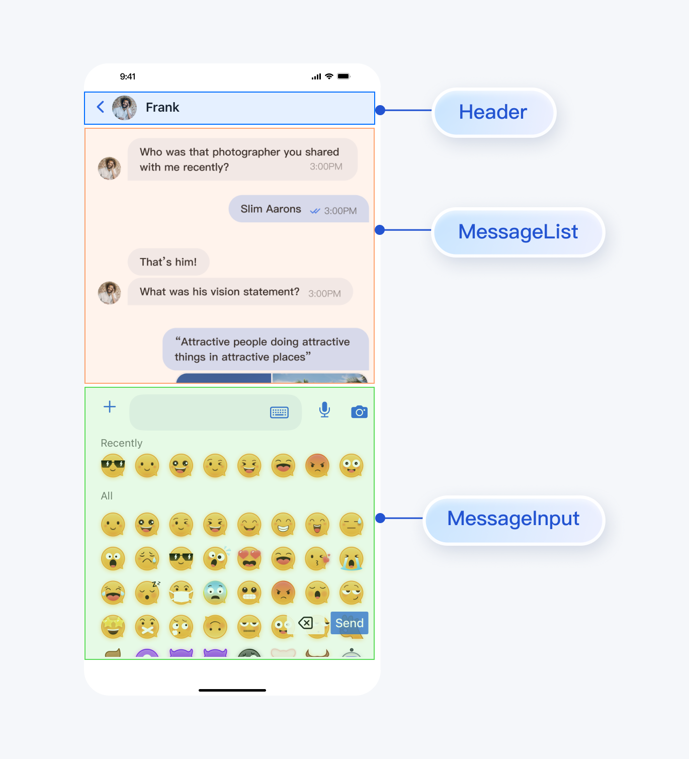 您可以将 MessageList 和 MessageInput 直接集成到现有的 App 页面中,也可以新构建一个完整的聊天页,组装后的一种 UI 效果如下图所示:
