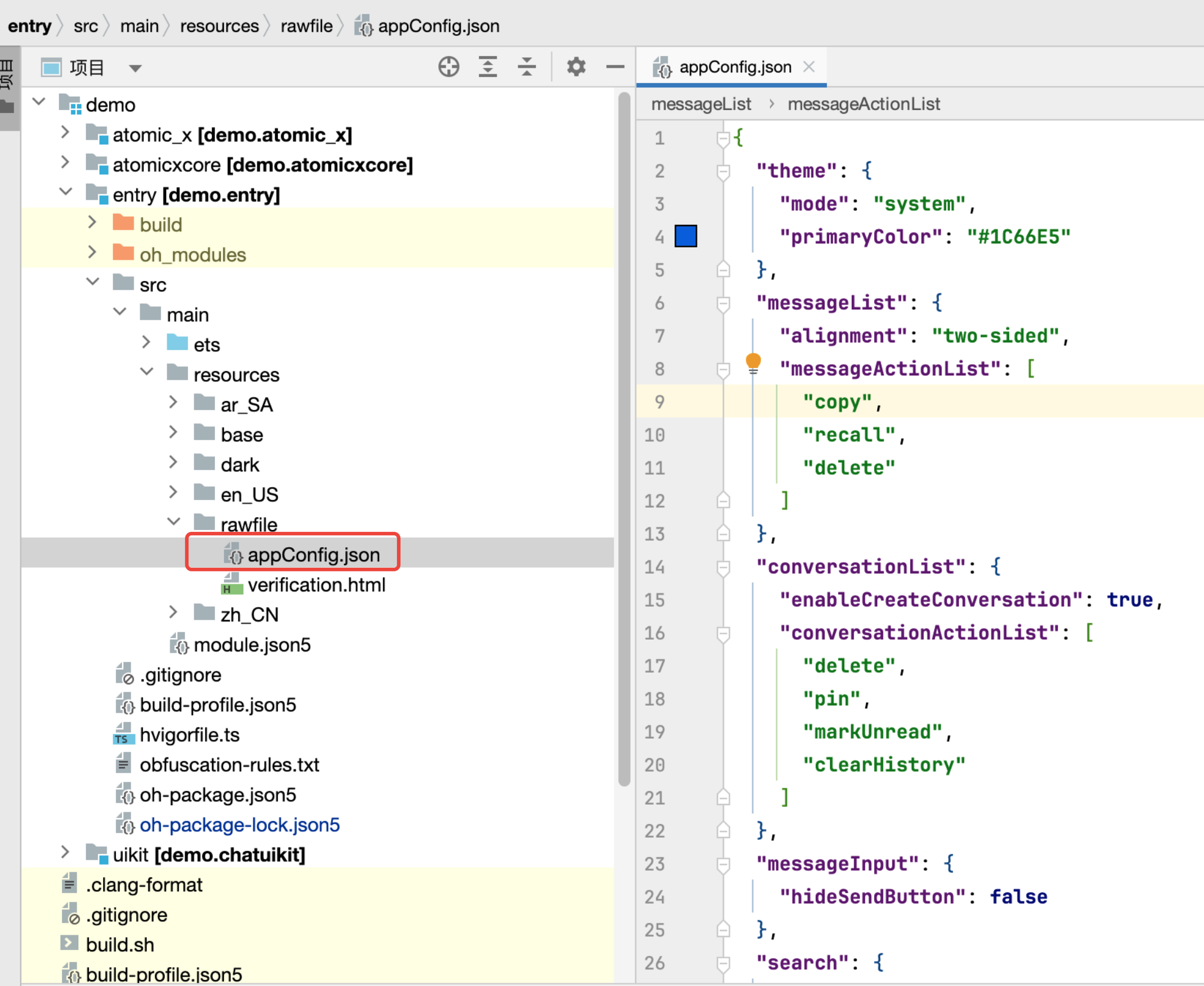 appConfig.json文件内容如下所示,与 AppBuilder 页面的配置项一一对应,与定义外观相关的配置是 theme及其子字段:{"theme": {"mode": "light", // 主题模式,light-浅色模式,dark-深色模式,system-自动跟随系统"primaryColor": "#E65100" // 主色调,16 进制颜色值},"messageList": {"alignment": "two-sided","enableReadReceipt": false,"messageActionList": ["copy","recall","quote","forward","delete"]},"conversationList": {"enableCreateConversation": true,"conversationActionList": ["delete","mute","pin","markUnread"]},"messageInput": {"hideSendButton": false,"attachmentPickerMode": "collapsed"},"search": {"hideSearch": false},"avatar": {"shape": "circular"}}