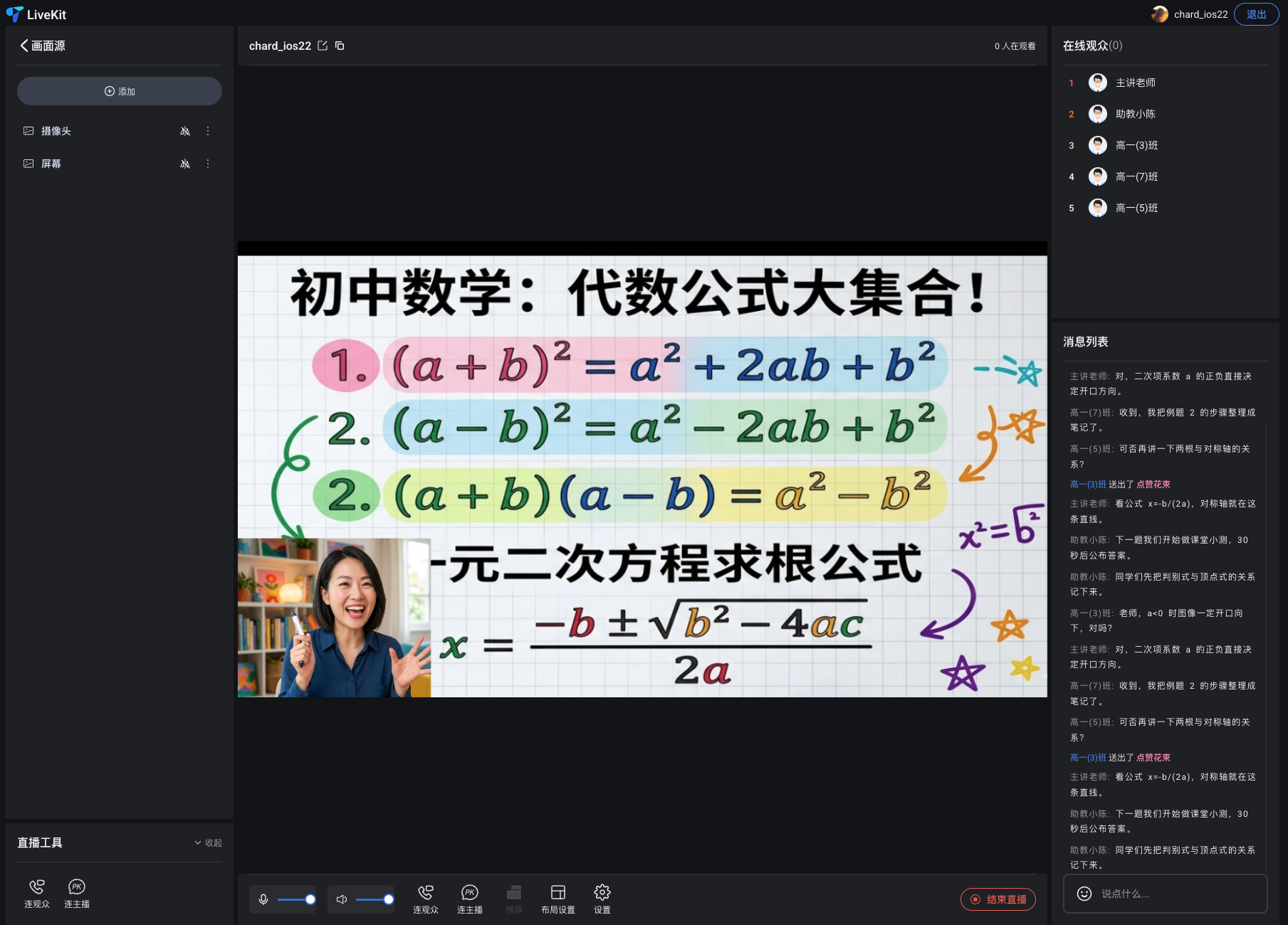 1. 添加视频源:在开播前,您需要添加直播画面源。该应用目前支持:摄像头、屏幕分享、窗口分享和图片。点击界面左侧的添加按钮,选择您需要添加的视频源。