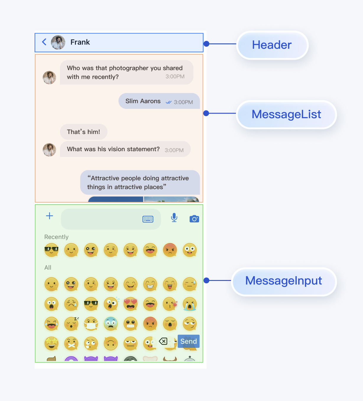 您可以将 MessageList 和 MessageInput 直接集成到现有的 App 页面中,也可以新构建一个完整的聊天页,组装后的一种 UI 效果如下图所示: