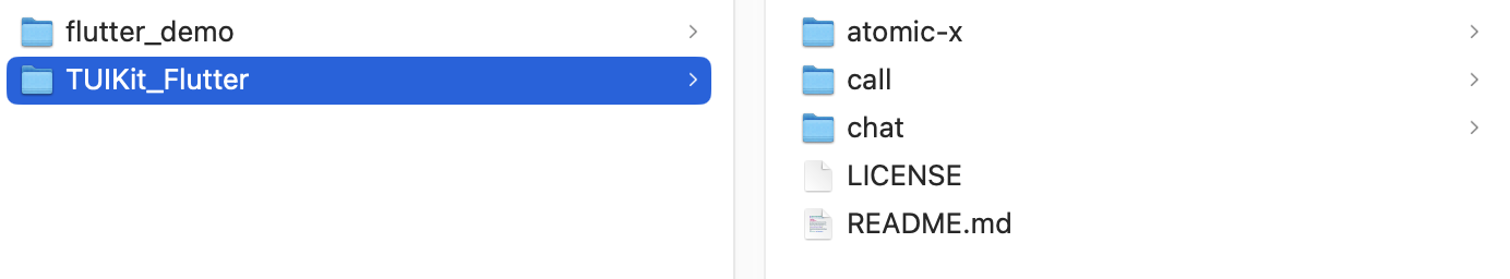 1. 将组件目录完整复制到您的 Flutter 项目中,如下图所示,其中 flutter_demo 是示例项目,TUIKit_Flutter 是从 GitHub 上下载的组件源码:
