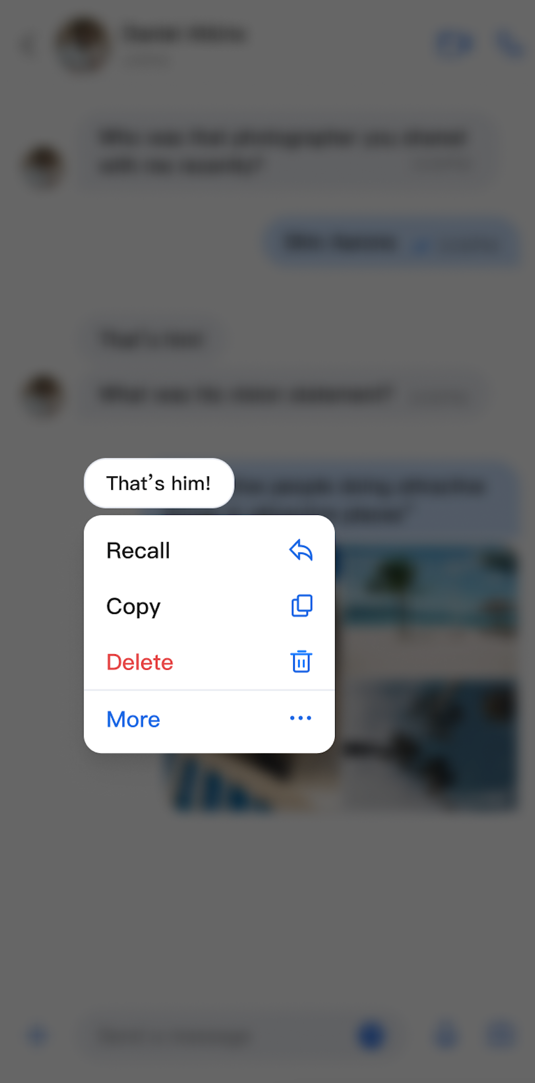 消息操作:支持长按菜单操作,例如复制、删除、撤回、以及自定义操作。
