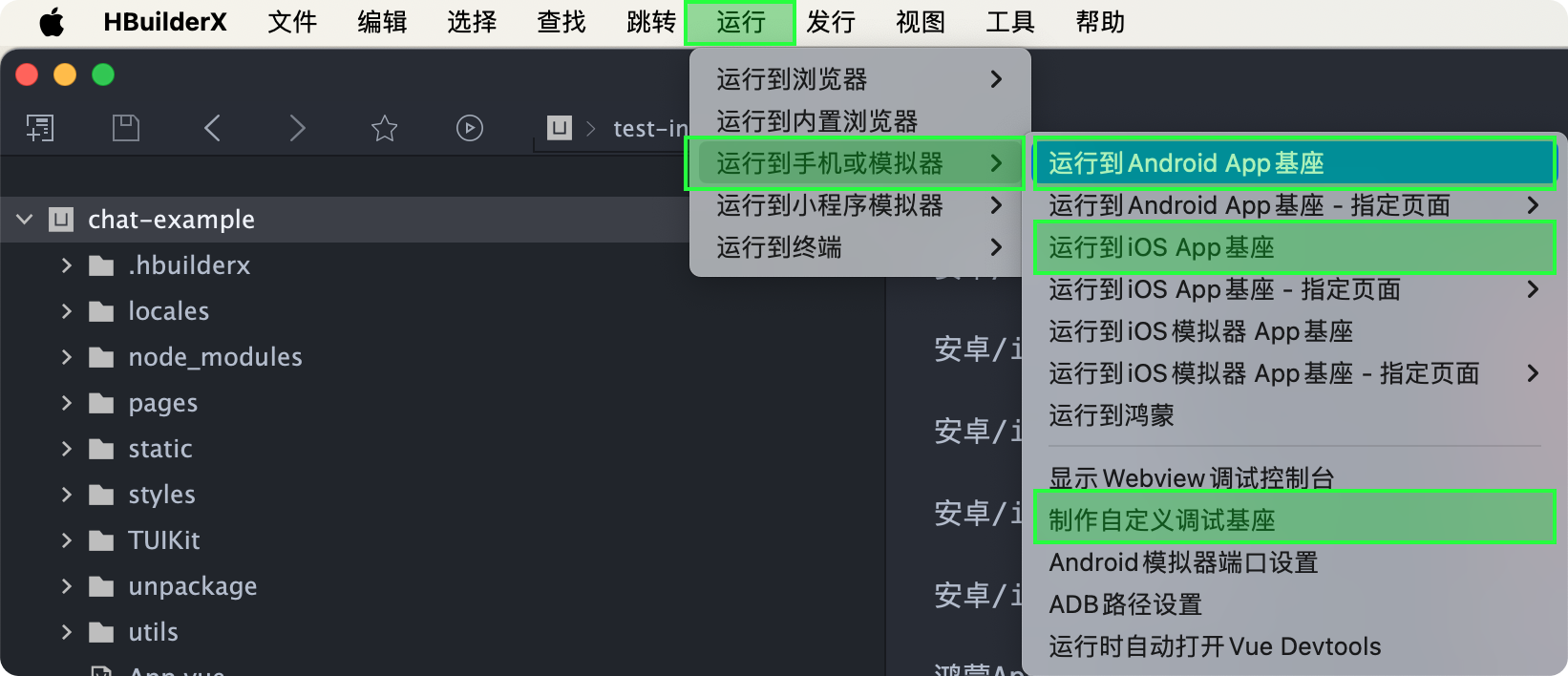 使用 HBuilderX 编译项目,单击菜单栏中的:运行 > 运行到手机或模拟器 > 运行到“指定”基座。