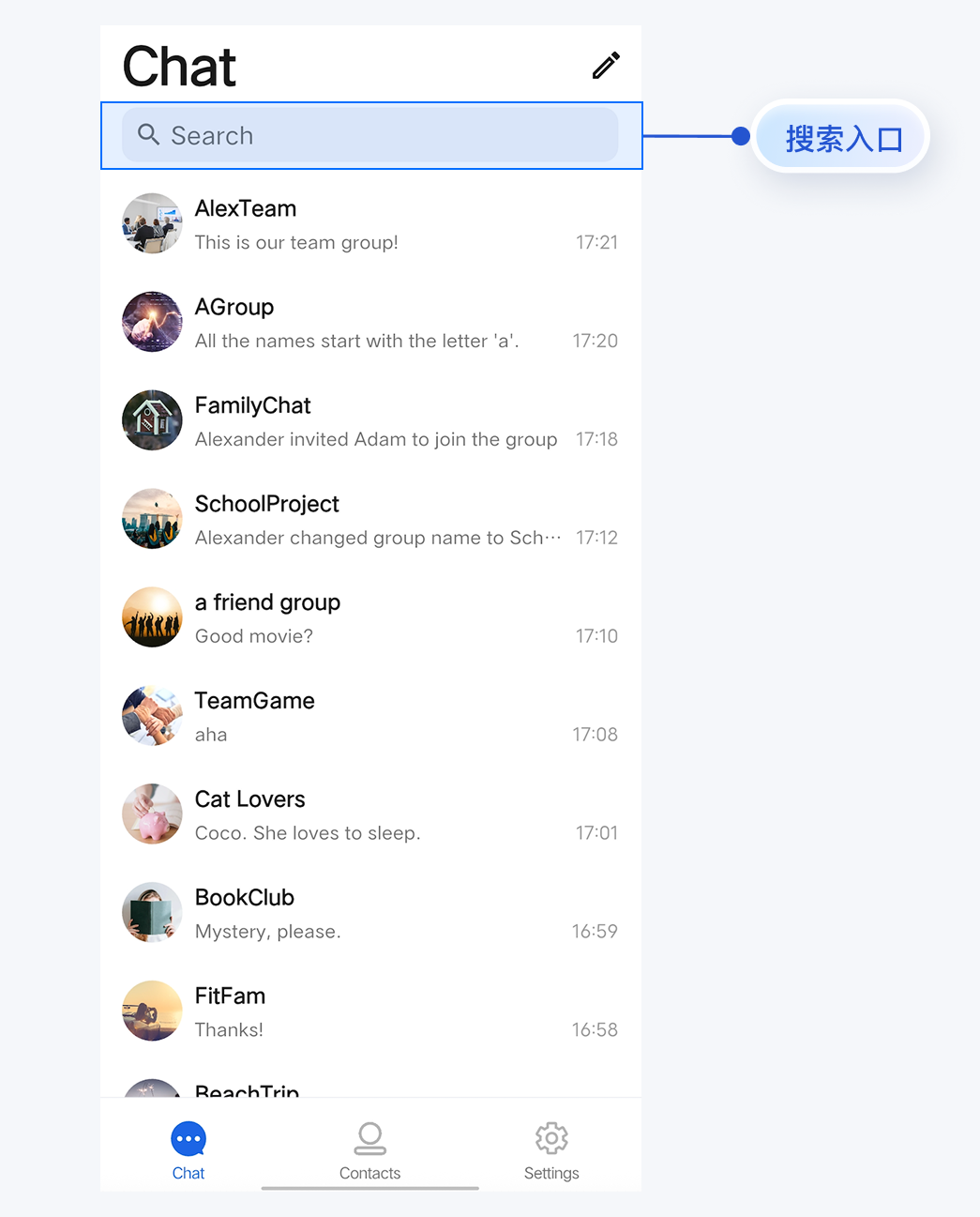 SearchBar组件可直接初始化使用,示例代码如下:SearchBar(onContactSelect: (FriendSearchInfo selectedContact) {// 联系人点击响应事件},onGroupSelect: (GroupSearchInfo selectedGroup) {// 群组点击响应事件},onConversationSelect: (MessageSearchResultItem selectedConversation) {// 会话点击响应事件},onMessageSelect: (MessageInfo selectedMessage) {// 消息点击响应事件},),