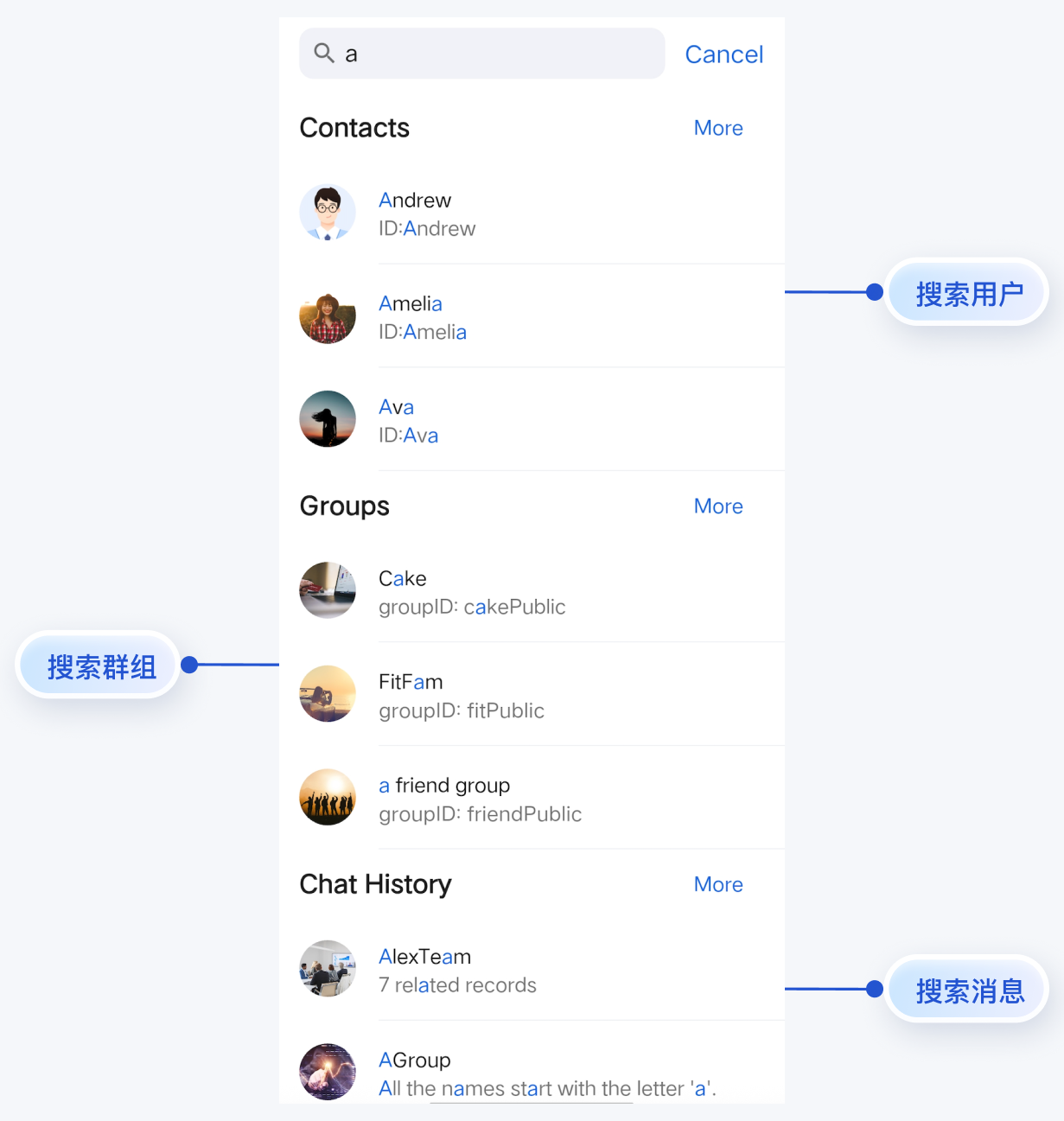 Search 是搜索组件,为用户提供搜索框、搜索结果展示、界面跳转等功能的完整组件集合。该组件支持用户搜索、群组搜索、消息搜索等功能,并提供了丰富的交互回调接口。