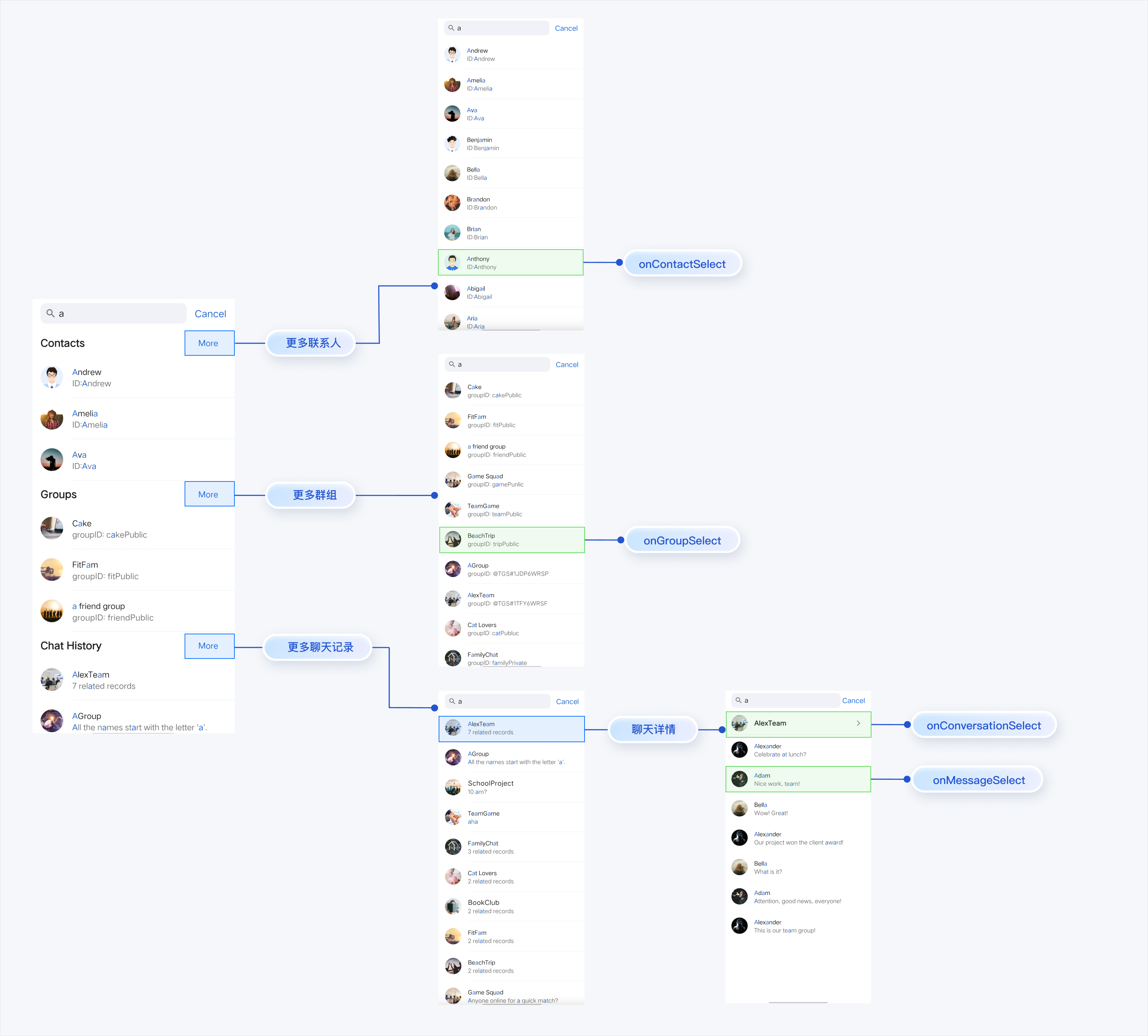 onContactSelect/onGroupSelect/onConversationSelect/onMessageSelect,需在回调中实现自定义跳转(例如跳转到您的自定义聊天界面)。如下图所示: