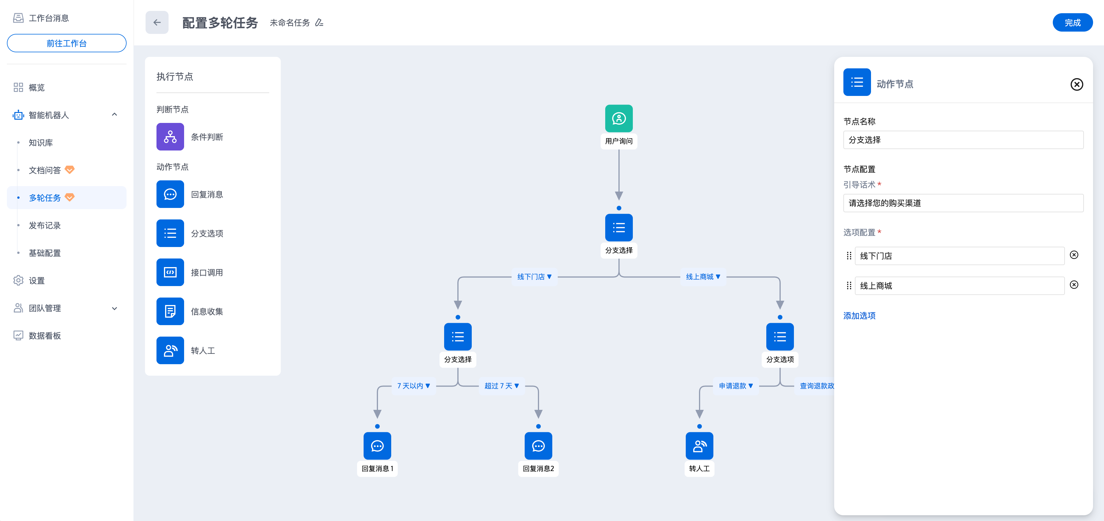 分支选项节点用于对用户不同的选择进行分流。每个分支节点可配置最多20个选项,每条选项不超过200个字符。