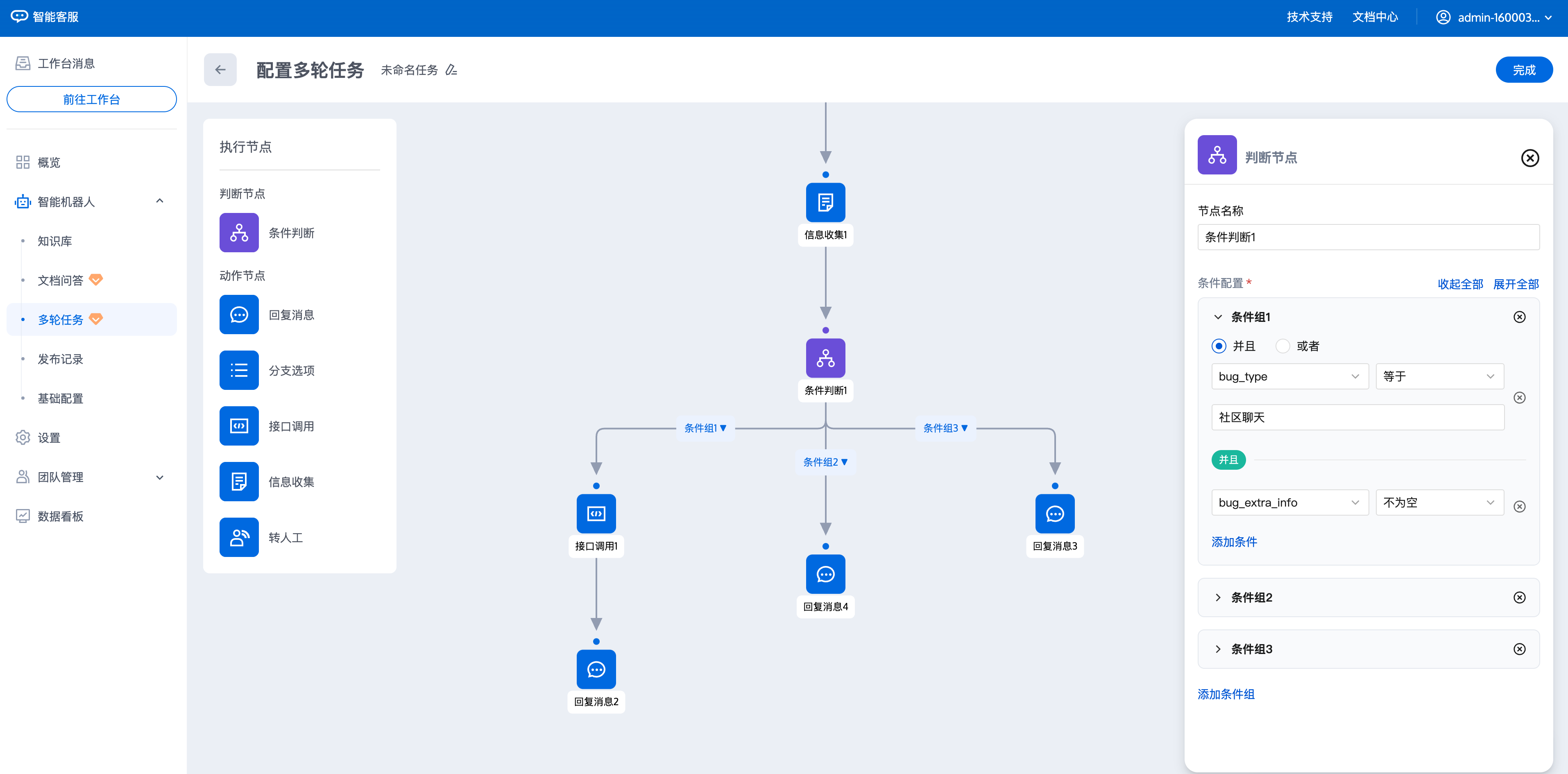 条件判断节点用于根据用户的账号信息或提供的信息,依次判断所有条件组,当其中一个条件组满足时,进入对应子流程。