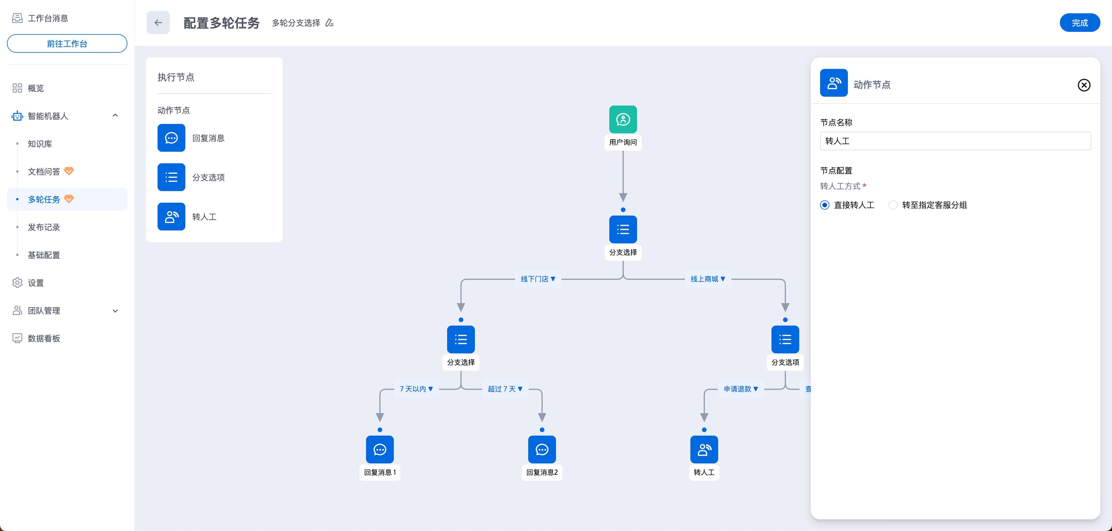 转人工节点用于将机器人进行中的会话转接给人工客服。支持两种转人工方式:直接转人工、转至指定客服分组。
