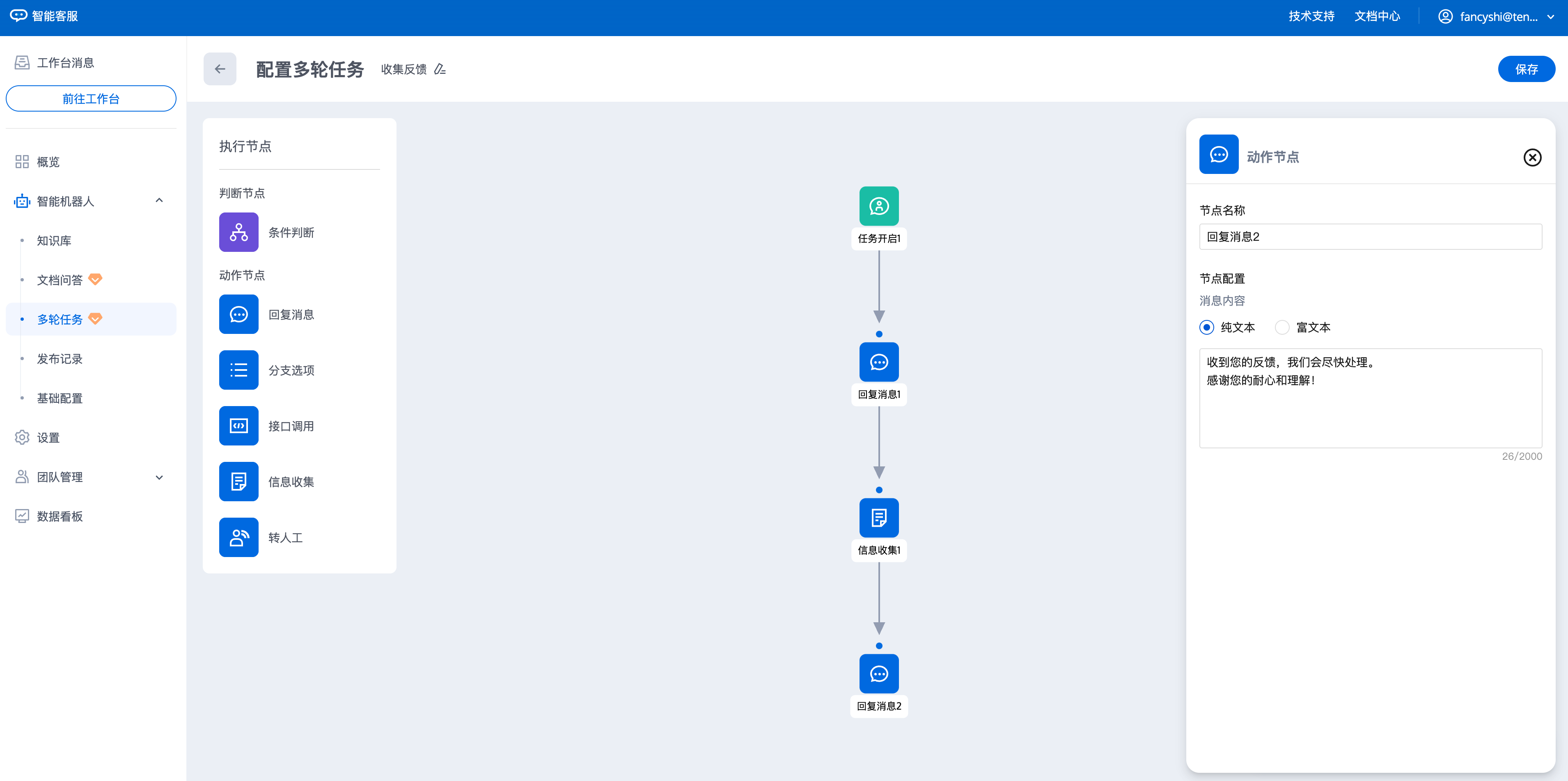 信息收集节点用于向用户收集信息。机器人发送问题表单,用户点击“提交”后,进入下一个节点;如用户未提交表单,流程将自动结束。