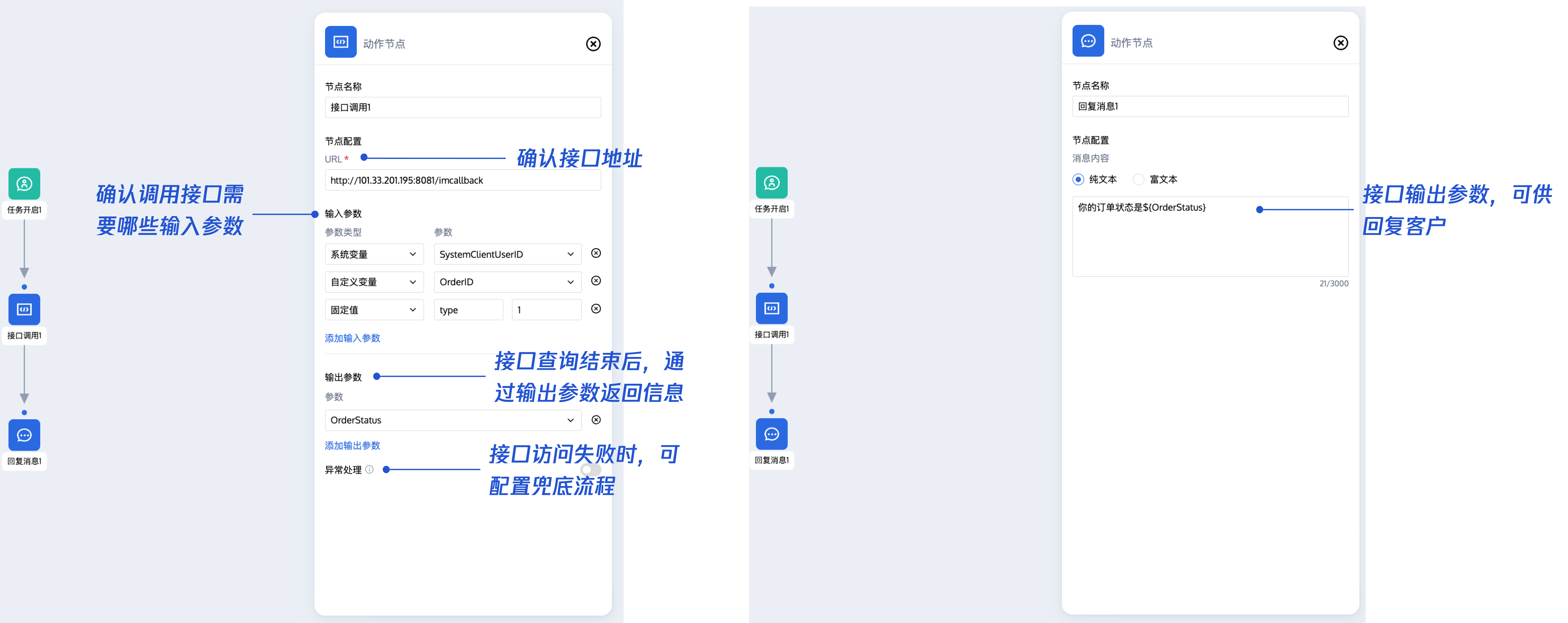 输出参数 | 接口调用结束后返回的自定义变量。可在后续接口调用、条件判断节点中使用。 | 接口需输出订单状态。 设置输出参数为 OrderStatus。 |