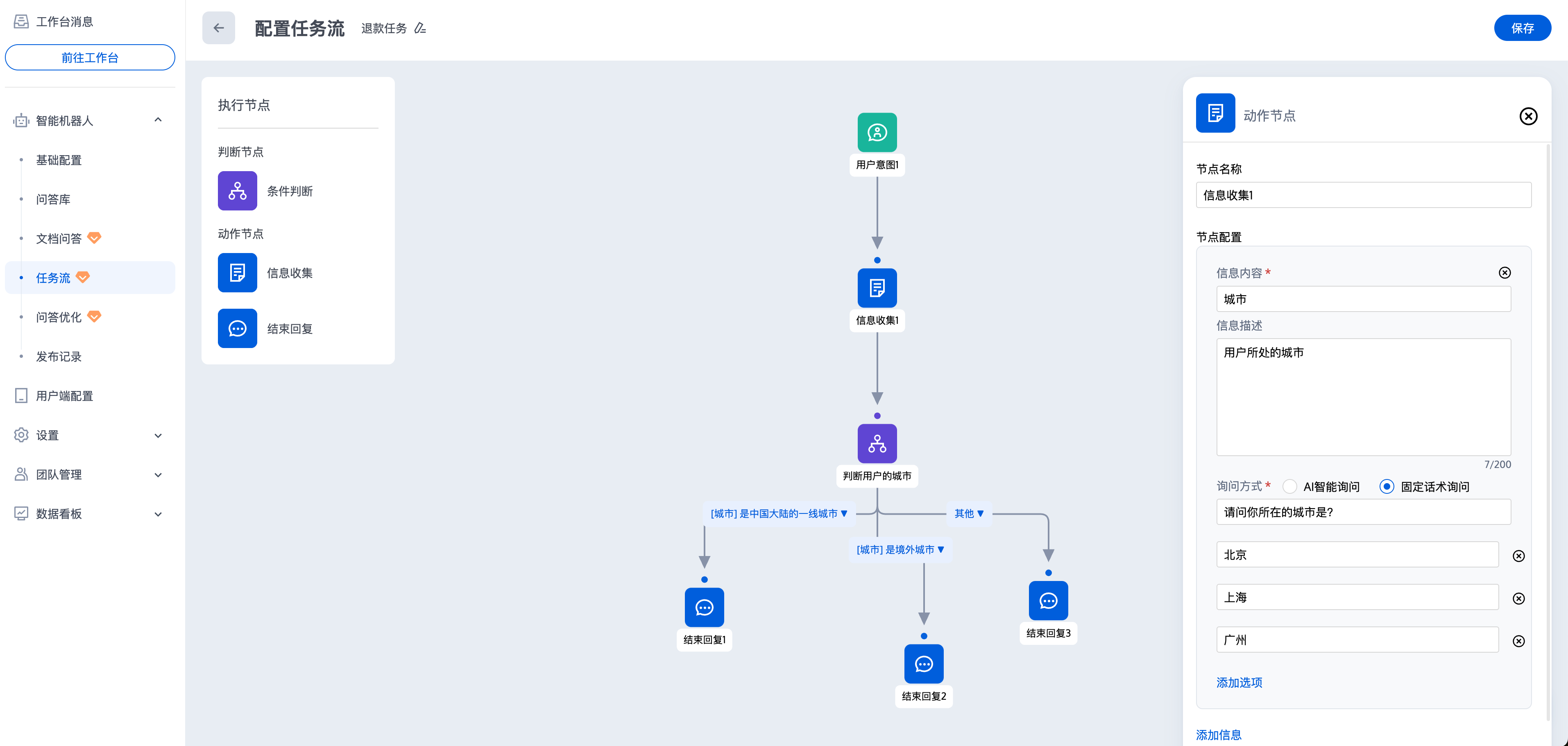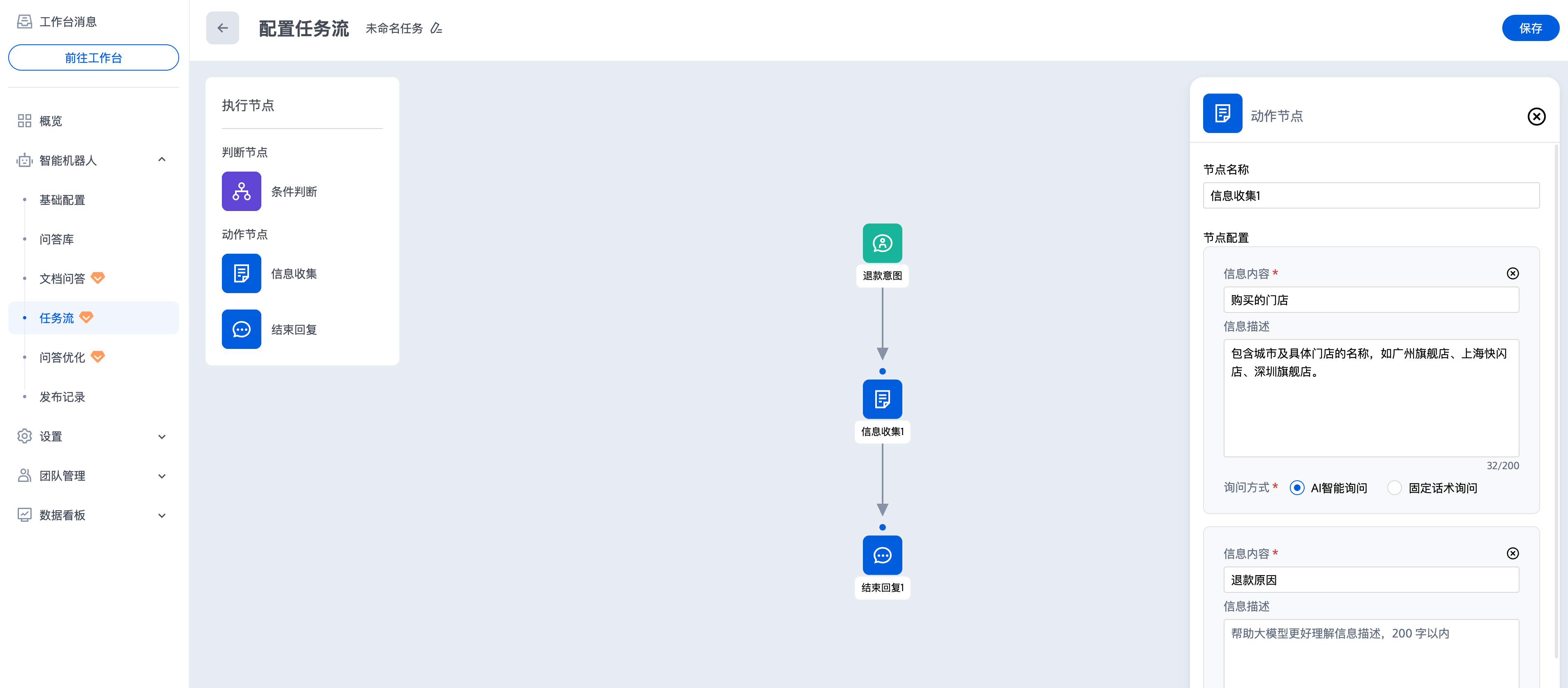 信息收集节点用于向用户收集信息,机器人通过上下文智能提取和追问的方式收集信息,收集到所有信息后,将进入下一个节点。