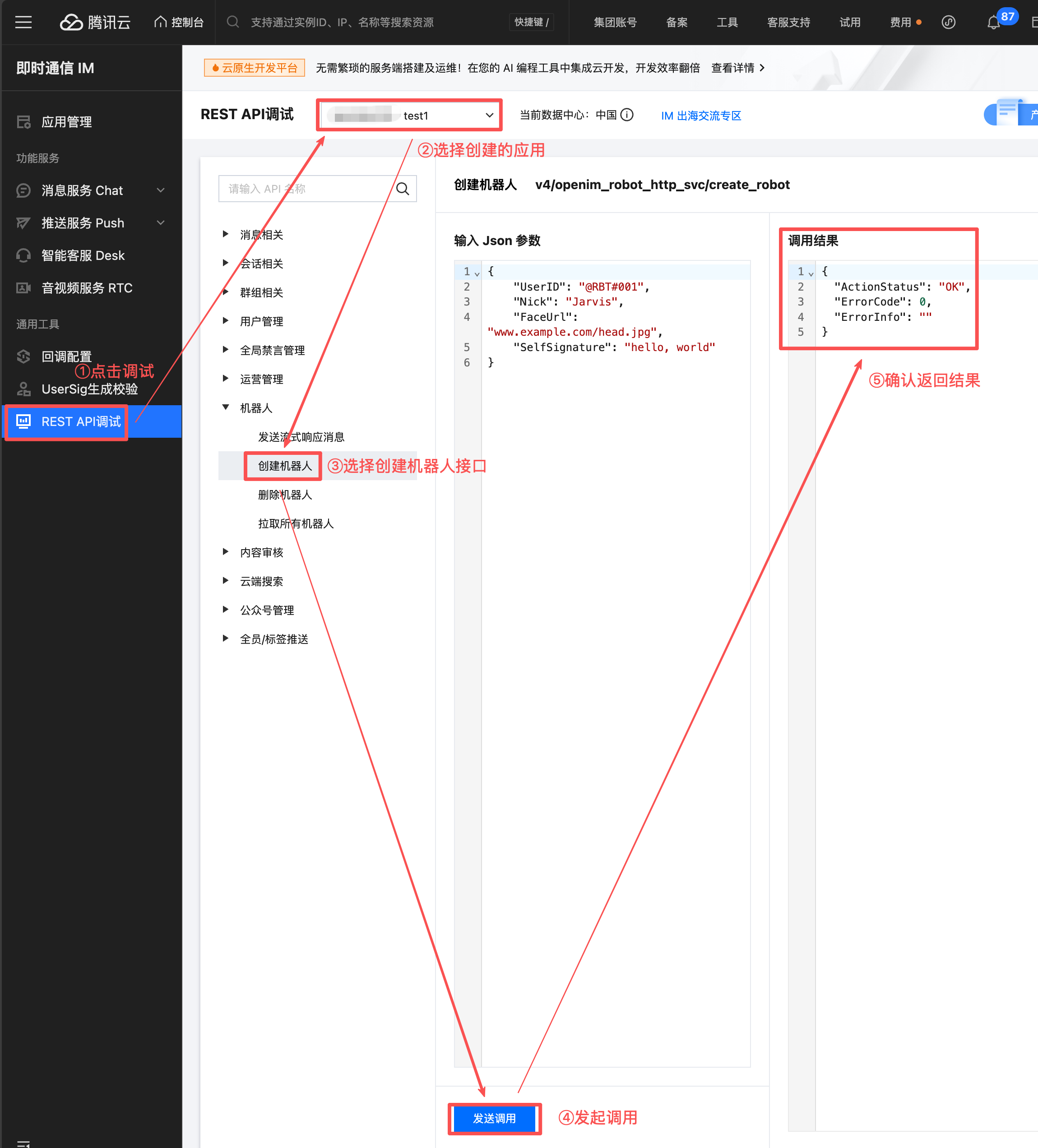 在即时通信 IM 控制台的左侧菜单栏中,点击 REST API 调试: