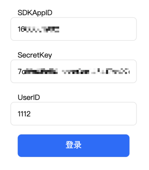 输入步骤1获取的 SDKAppID 与 SecretKey,用于完成服务鉴权。UserID 可任意填写:系统将自动以此 ID 创建并登录新用户。