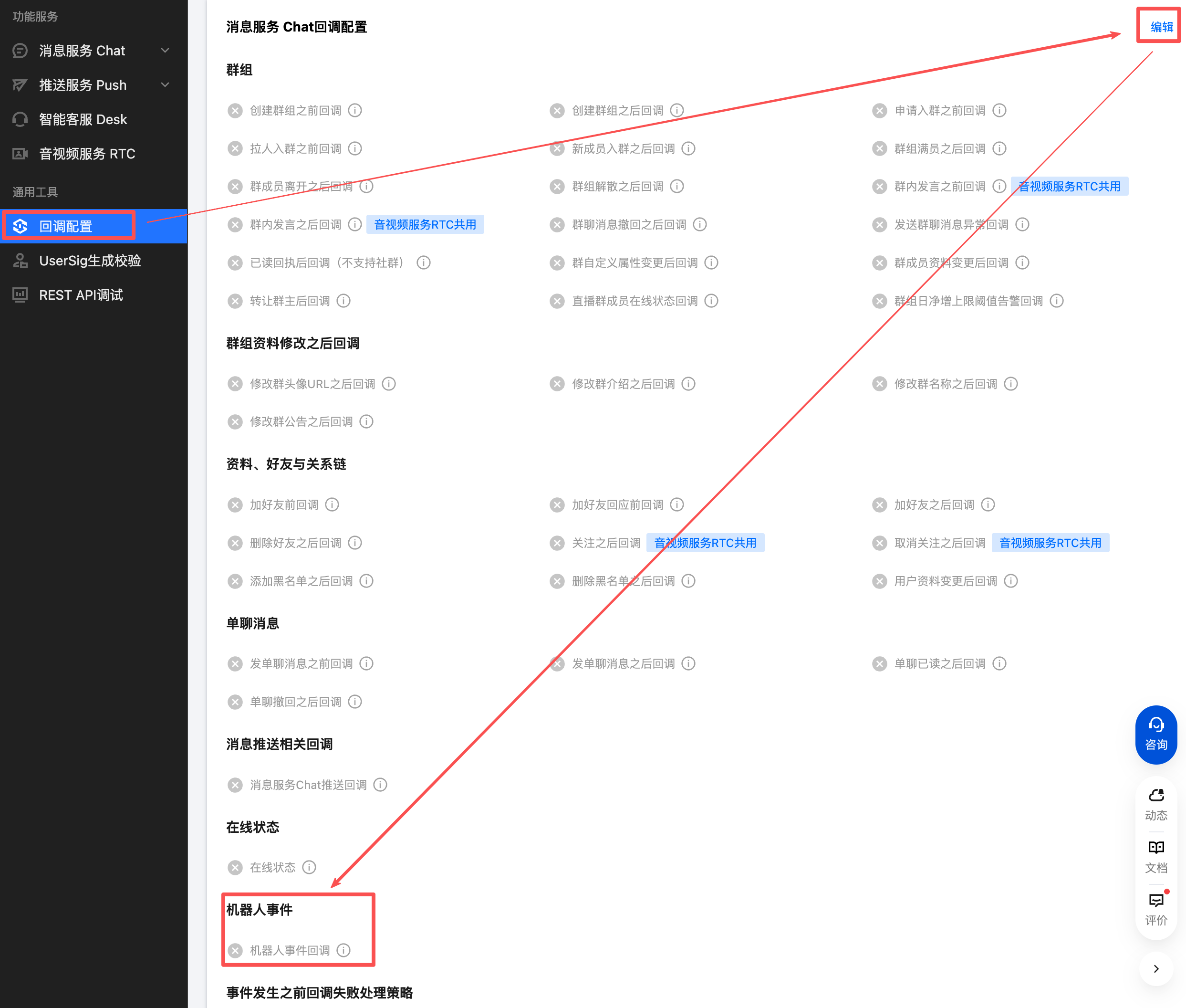 首先,请在即时通信 IM 控制台左侧菜单选择回调配置 > 消息服务 Chat,随后单击右上角的编辑,配置后台回调 URL。