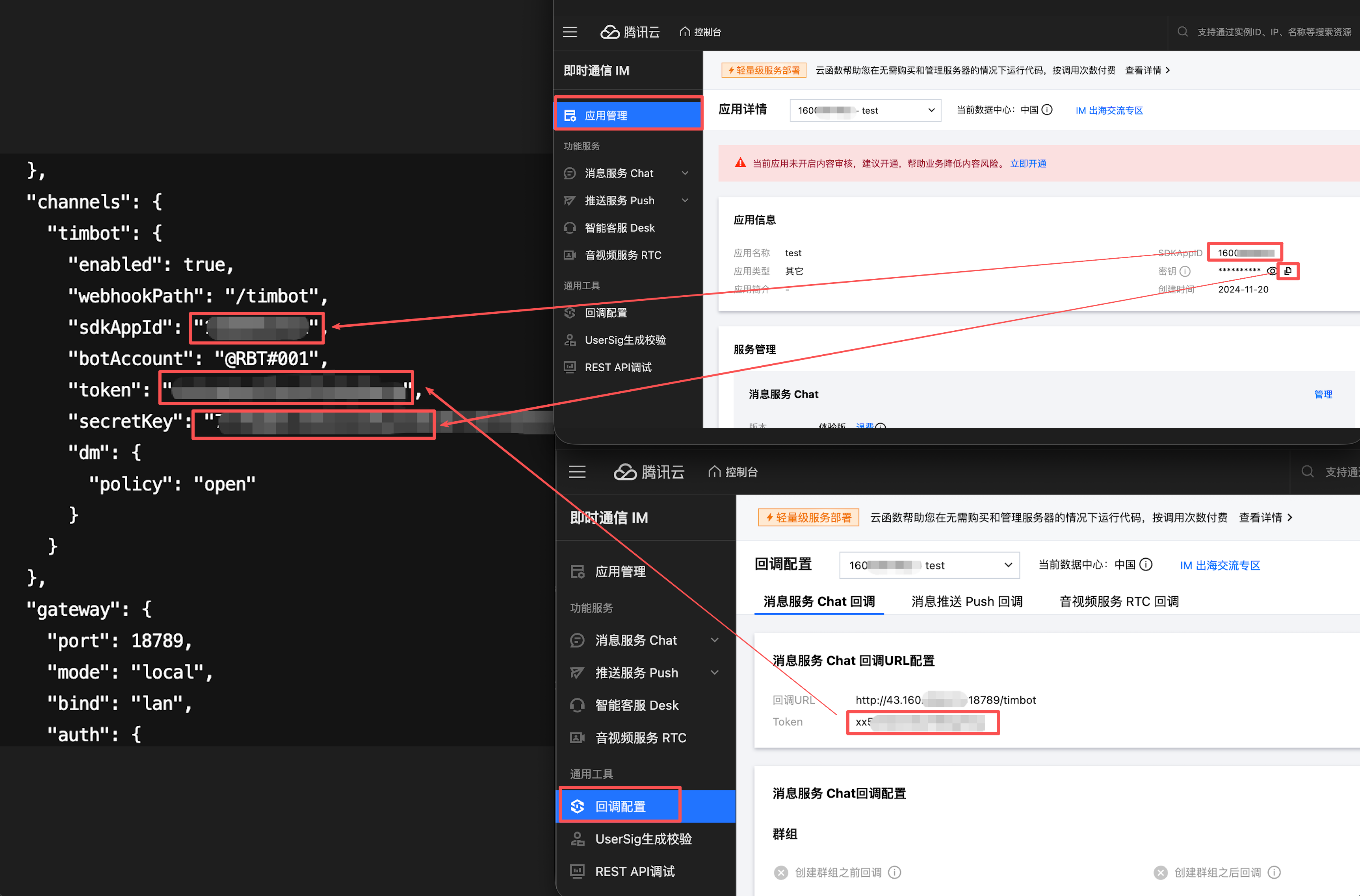 "channels": {"timbot": {"enabled": true,"webhookPath": "/timbot","sdkAppId": "16000xxxxx", // 填入 步骤1 获取的 SDKAppID"botAccount": "@RBT#001","token": "mysecrettoken", // 填入 步骤3 设置的鉴权 Token"secretKey": "xxxxxx", // 填入 步骤1 获取的 SecretKey"dm": {"policy": "open"}}}