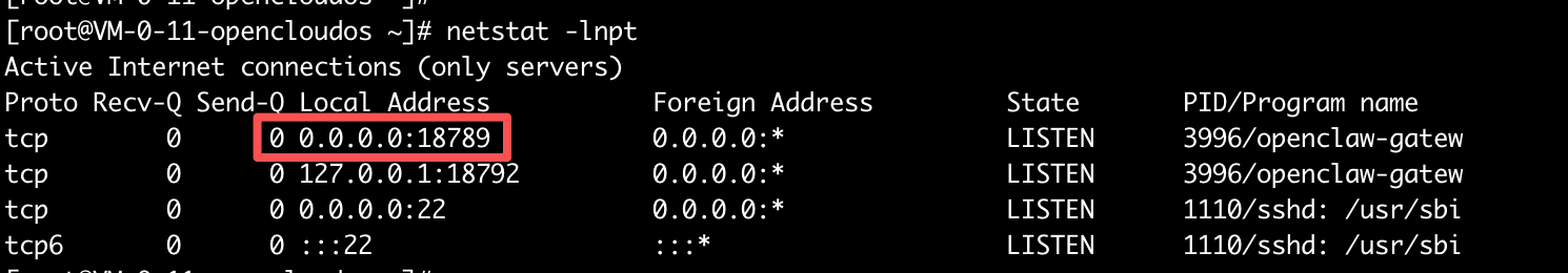 使用下面命令查看直到18789端口的绑定地址变为0.0.0.0表示成功: