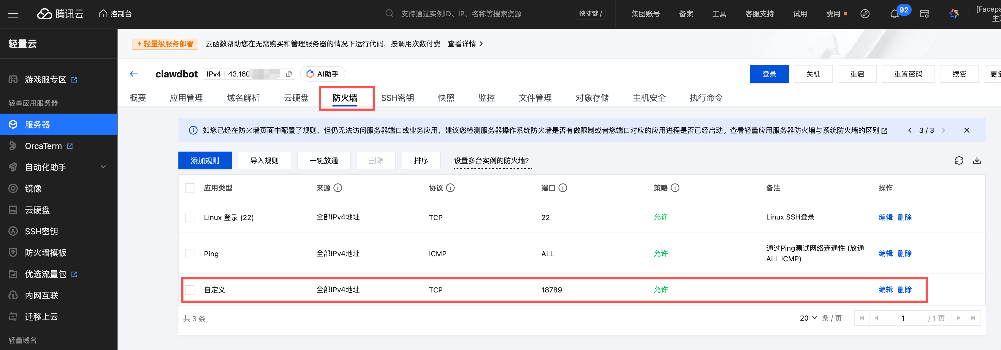 为了确保腾讯云的回调请求能穿透防火墙到达 OpenClaw,需要放行 18789 端口。