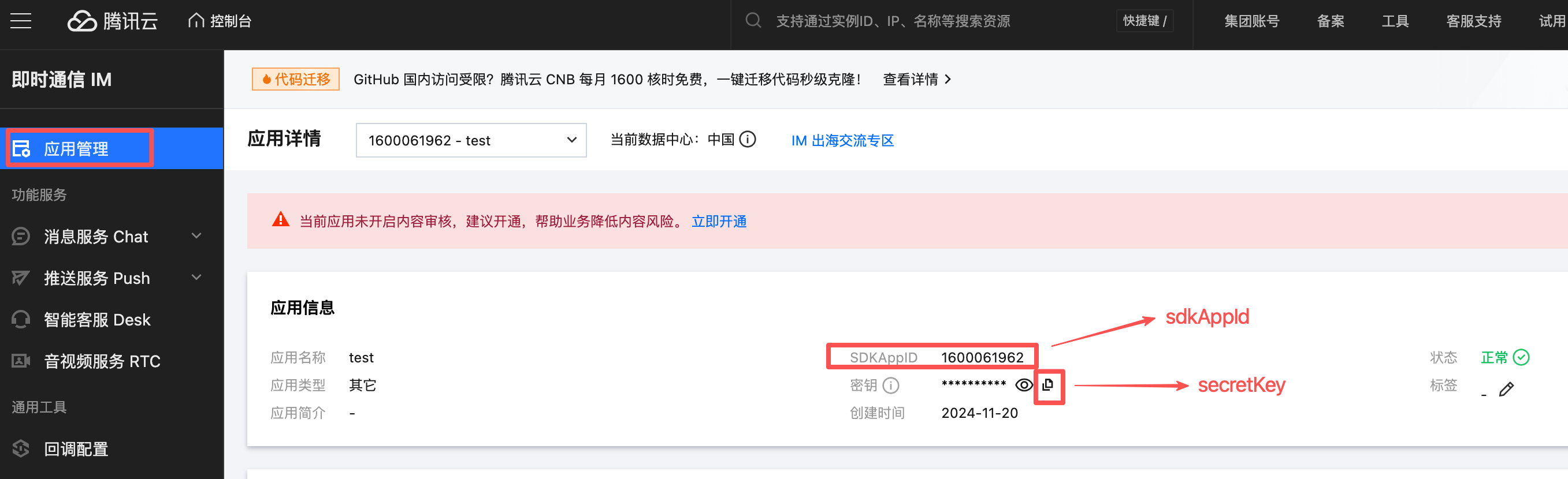 SDKAppID:应用的唯一标识 ID 。SecretKey:用于生成鉴权签名的密钥 。
