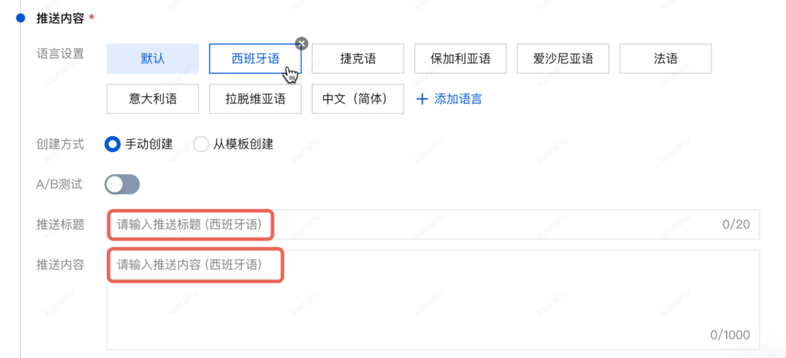 2. 针对已选择的每种语言,逐一填写对应的推送标题和推送内容,确保文案准确贴合对应语种的表达习惯。