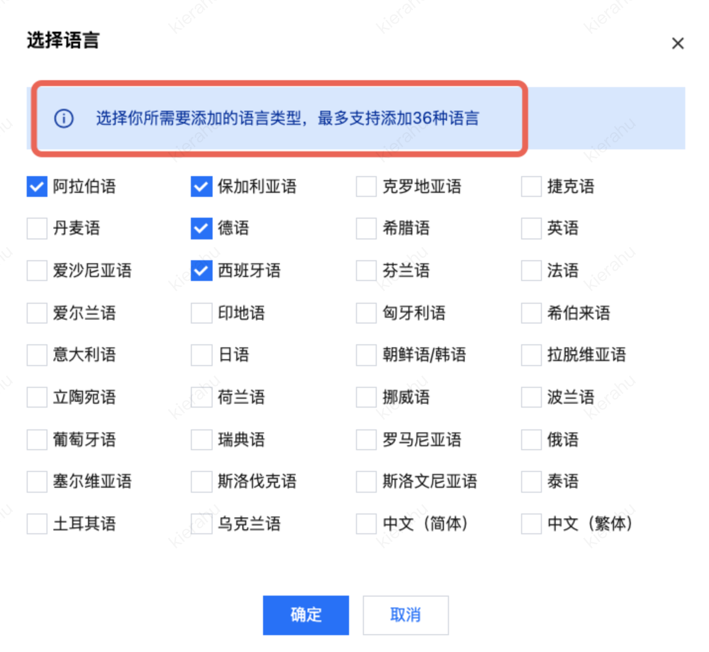 1. 点击手动添加后,选择需要配置的语言类型(最多支持添加 36 种语言),点击确定。
