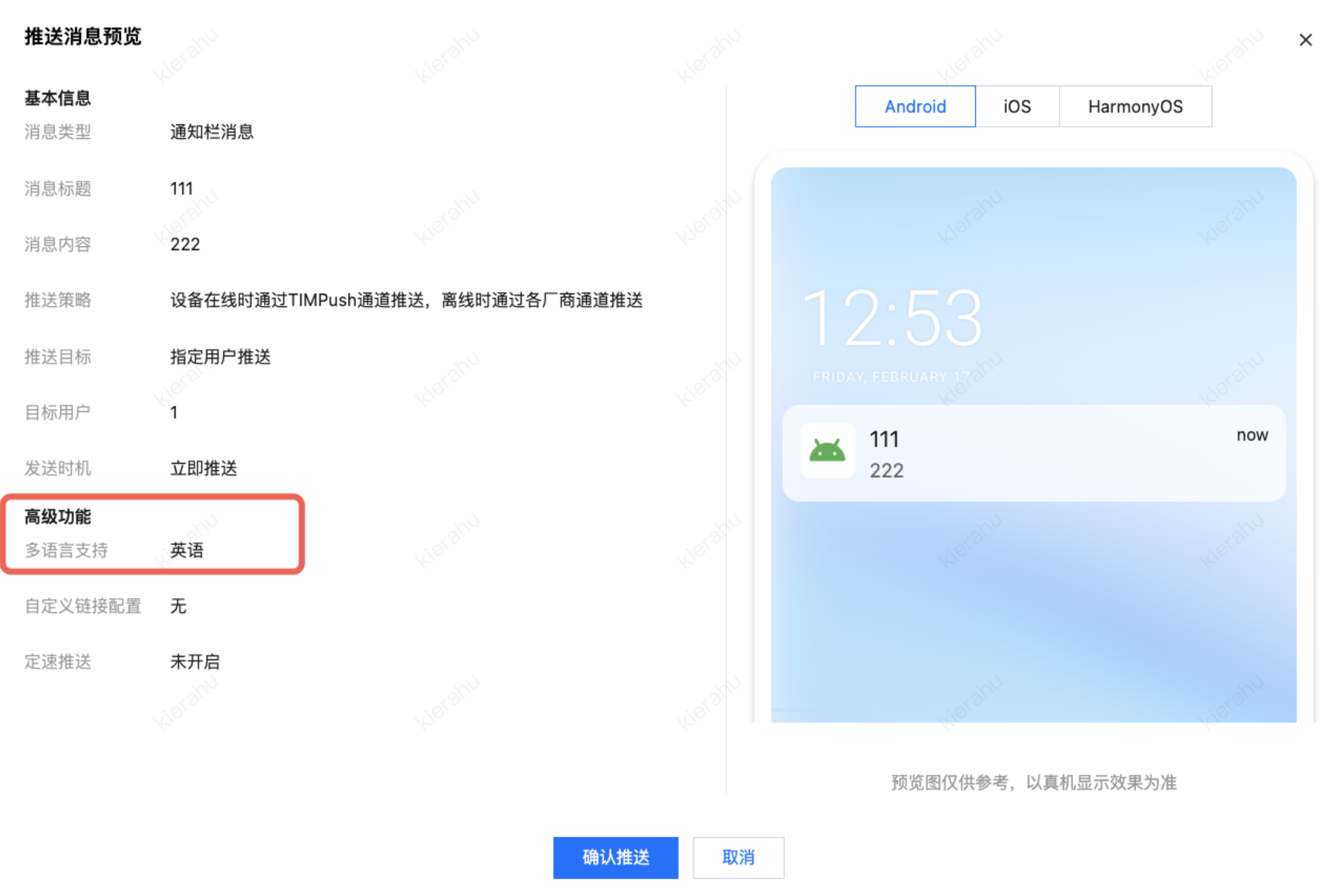 4. 多语言文案配置完成后,预览推送消息,确认所有语言版本的标题、内容无误后,点击确认推送,即可启动多语言智能推送。