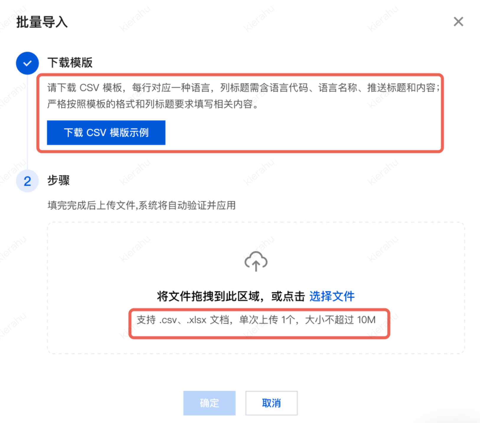 1. 点击批量导入,点击下载 CSV 模板示例,模板每行对应一种语言,列标题固定为语言代码、语言名称、推送标题、推送内容。