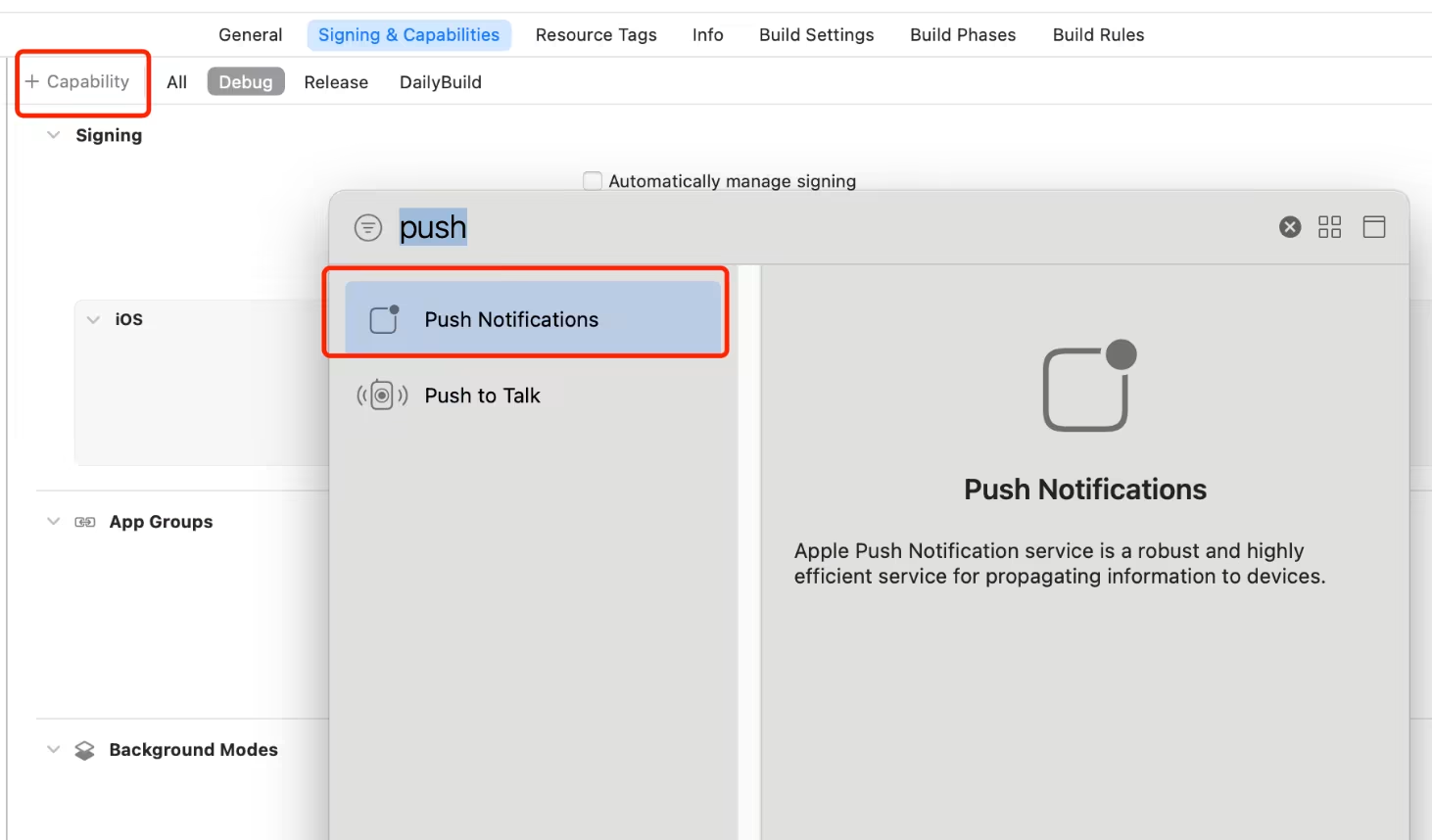 原因1:在 Xcode 项目中未启用推送通知权限,检查 Xcode 配置。开启方法参考:Xcode 添加推送权限。