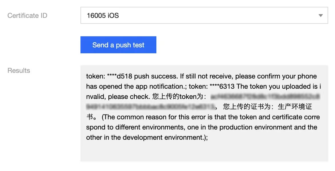 iOS 推送证书分正式环境和测试环境,Token 也分正式环境。Token 和证书必须对应上才能推送。