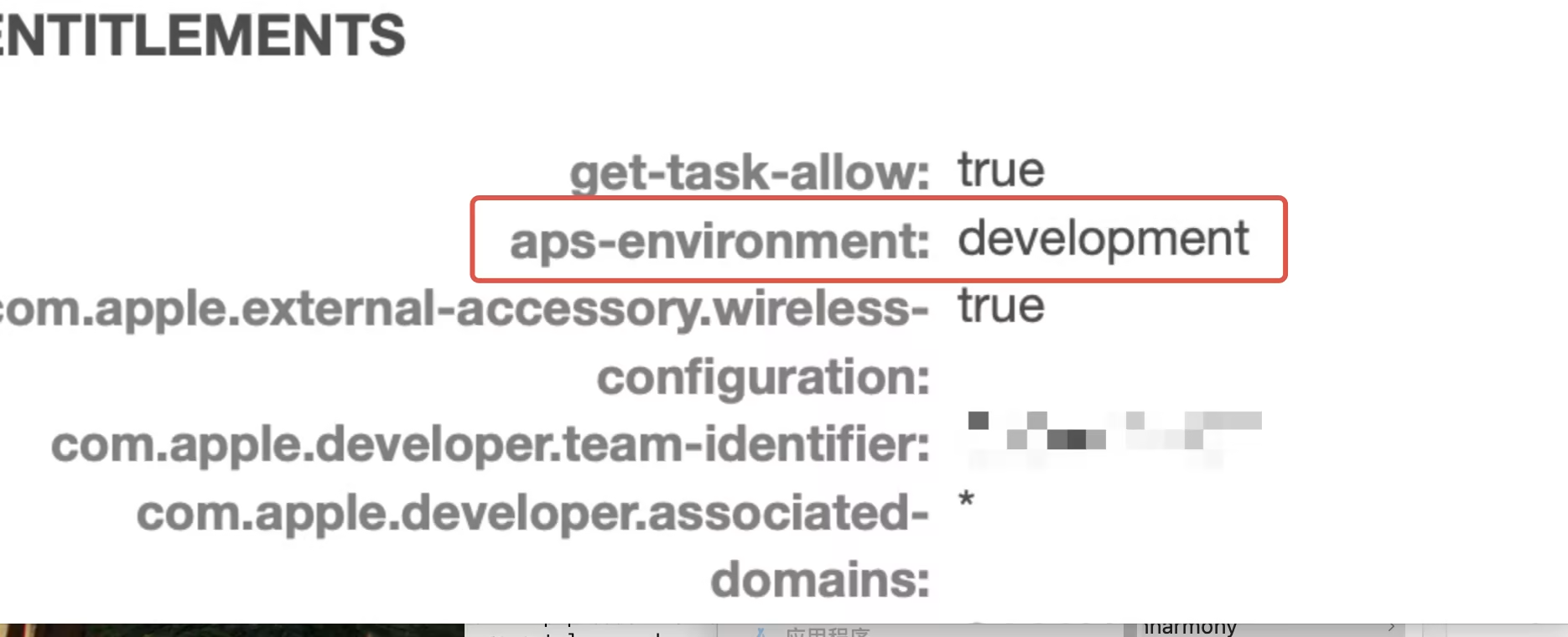 原因2:在应用归属的 AppleID 账号下,对应应用未勾选 Push Notifications 开启远程推送服务。可以查看描述文件是否包含 “aps-environment”, 以及是否对应正确开发/生产环境。开启方法参考:申请 APNs 证书。