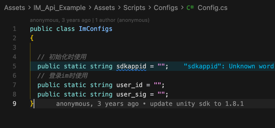 Config.cs 文件,路径:Assets/IM_Api_Example/Assets/Scripts/Configs/Config.cs。3. 设置 步骤 2 中获取的 SDKAppID、UserID、UserSig。