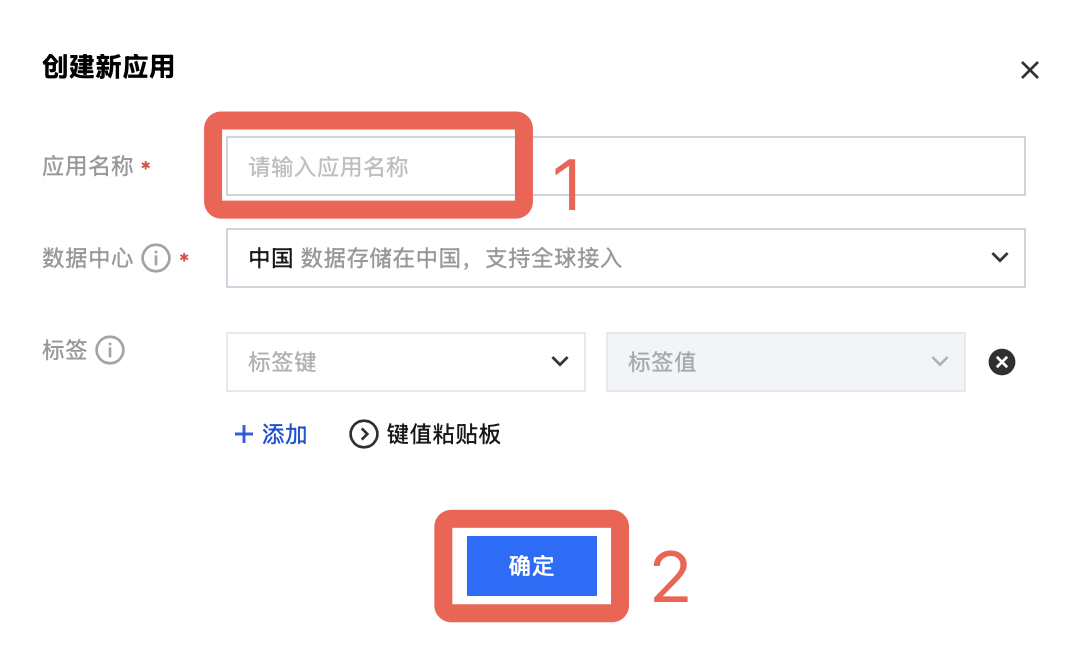3. 输入应用名称、选择合适的数据中心,完成应用的创建。