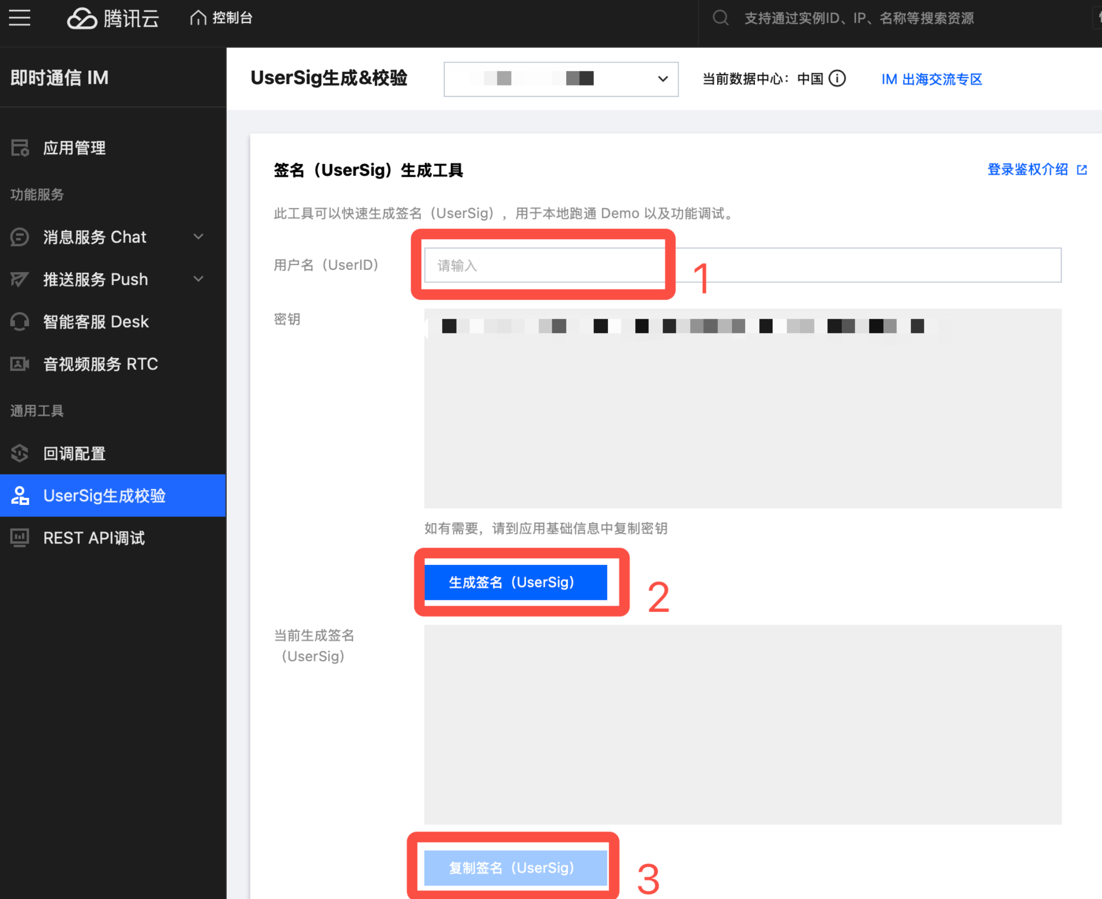 2. 在 UserSig生成校验 中,创建用户并生成 UserSig。
