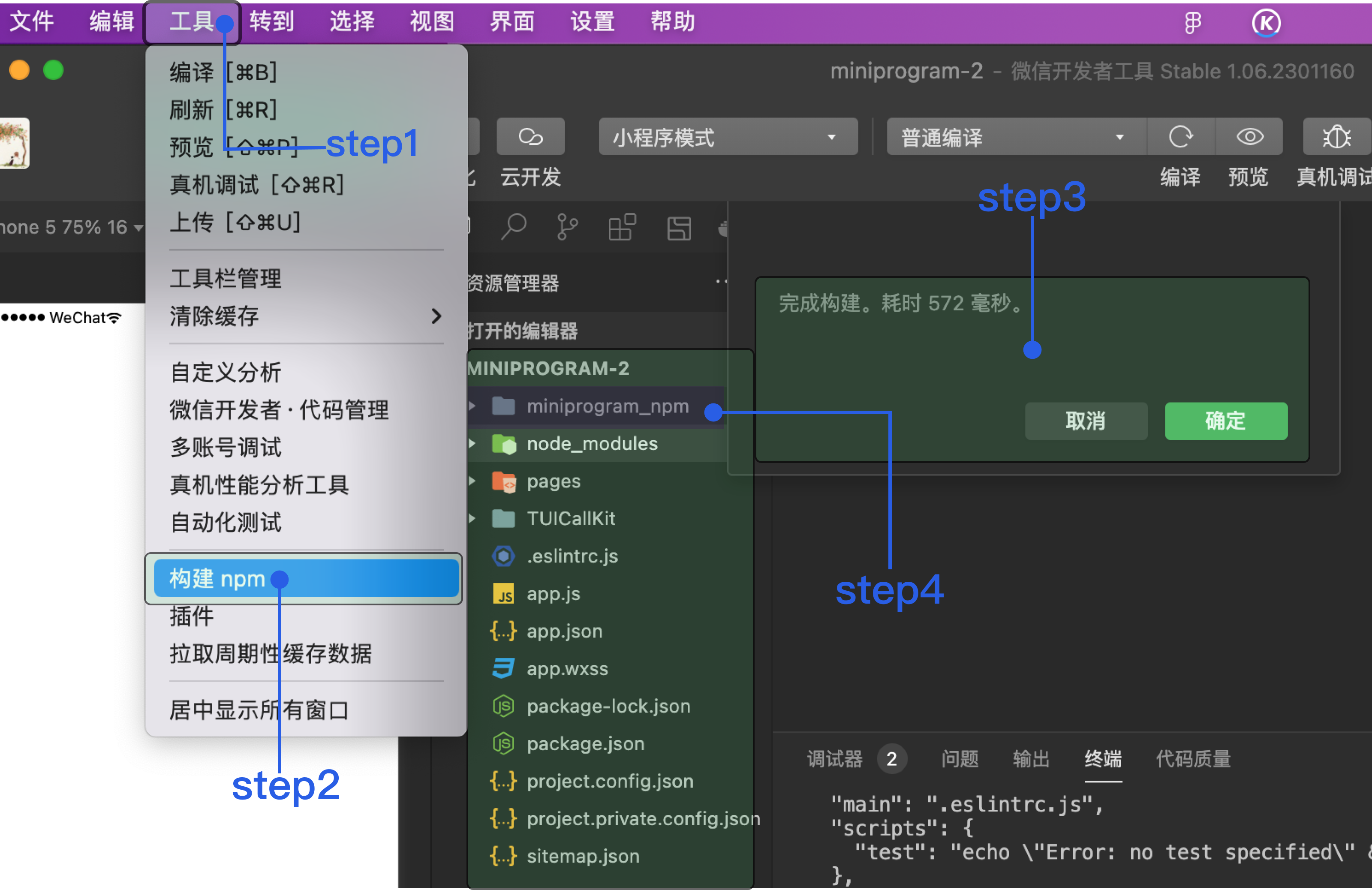 打开微信开发者工具单击 工具 > 构建 npm,新增 miniprogram_npm 目录。目录如下: